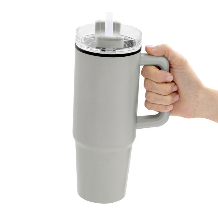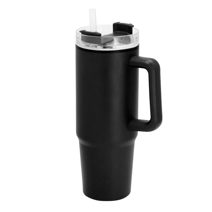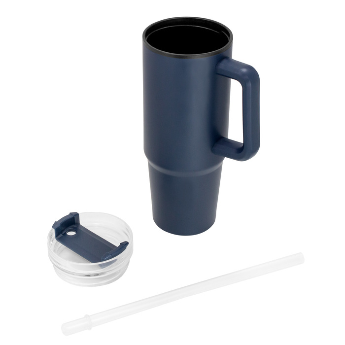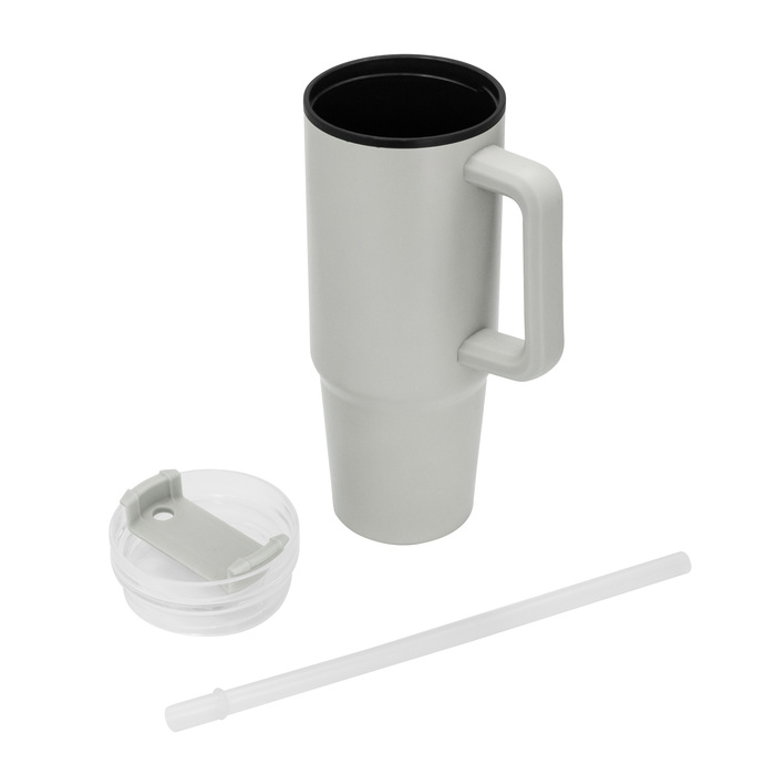 Mug doble pared, sellado al vacío con pitillo. Tecnología Vacuum. Interior en plastico PP y exterior en acero, con tapa plástica transparente a rosca con anillo de silicona. Cierre giratorio porta pitillo, pitillo plástico translucido. Pintura exterior con acabado mate.