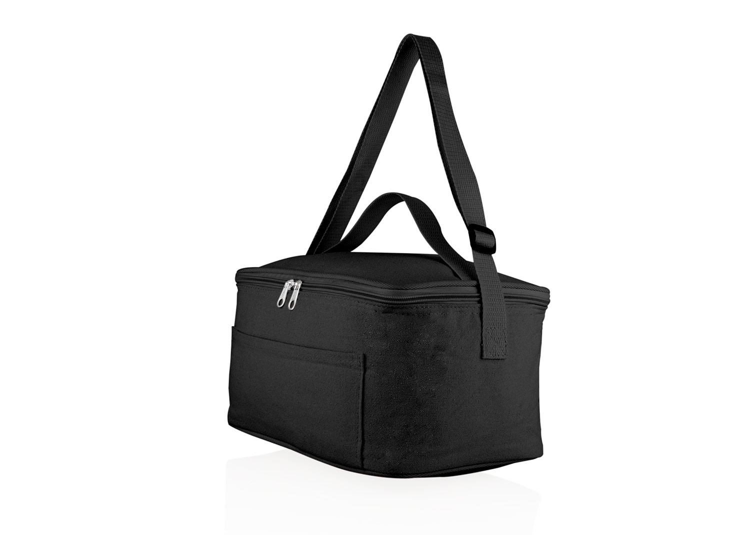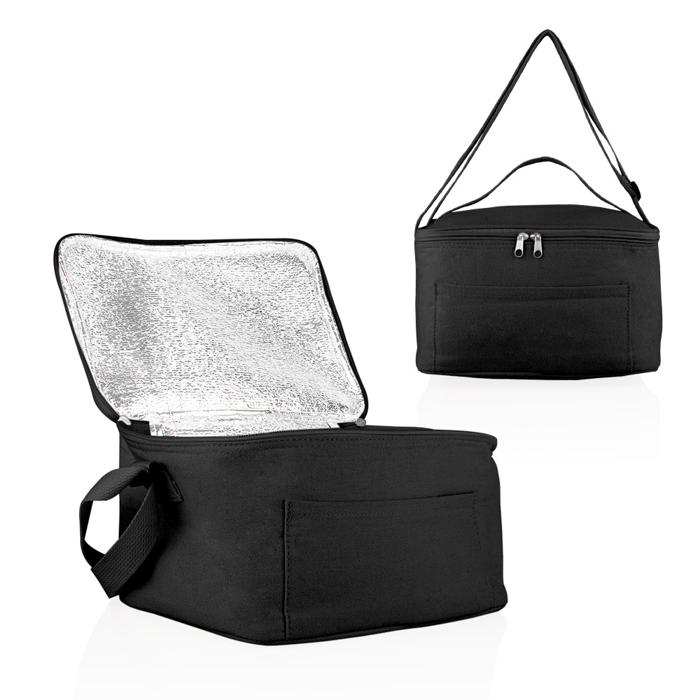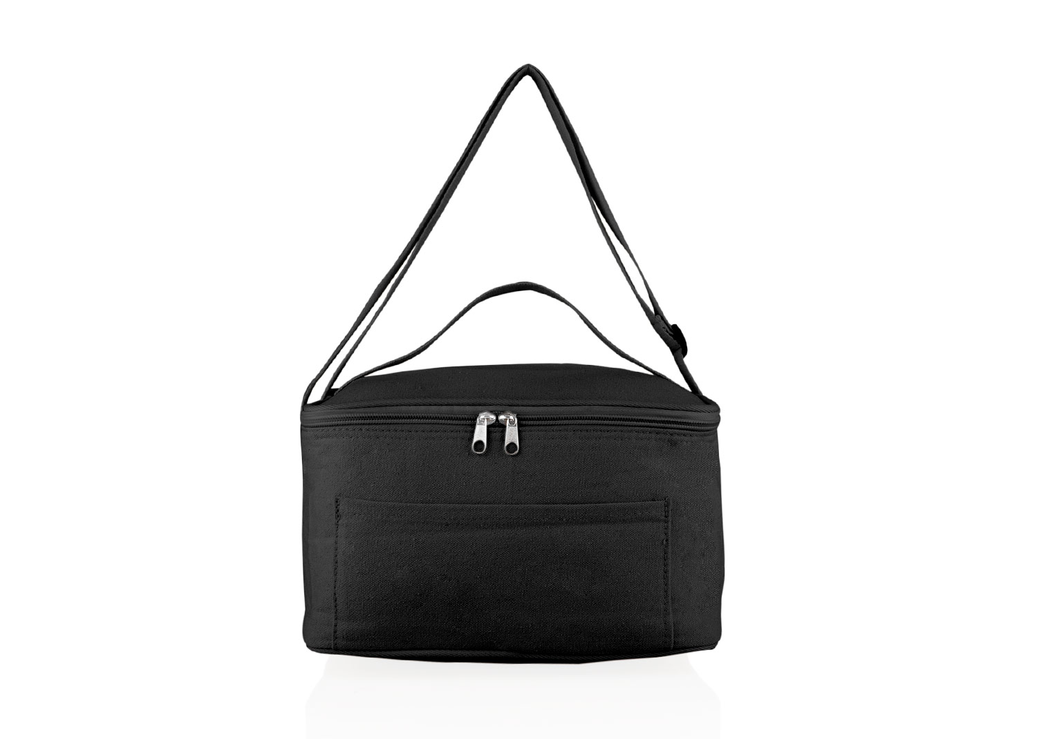 Lonchera térmica de algodón con interior de aluminio. Bolsillo frontal y asas de tela resistentes ajustables.