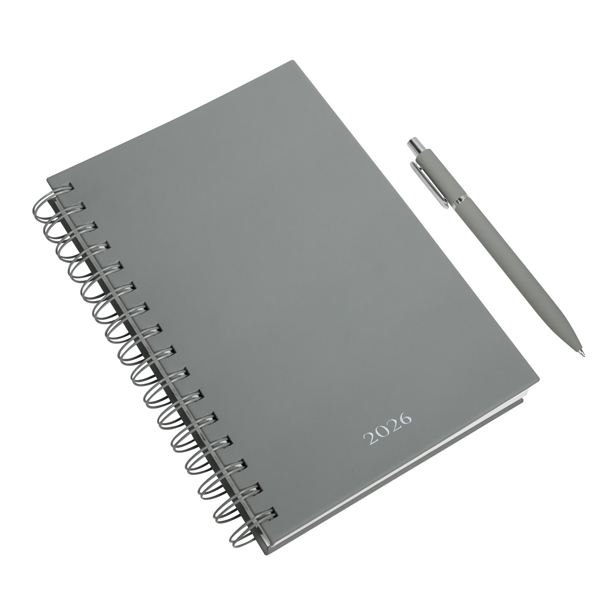 Agenda diaria con 174 hojas. Contiene datos personales, calendarios 2025-2026-2027, planeador 2026 y seguimiento de nuevos hábitos. Incluye bolígrafo metálico y caja individual tipo regalo.