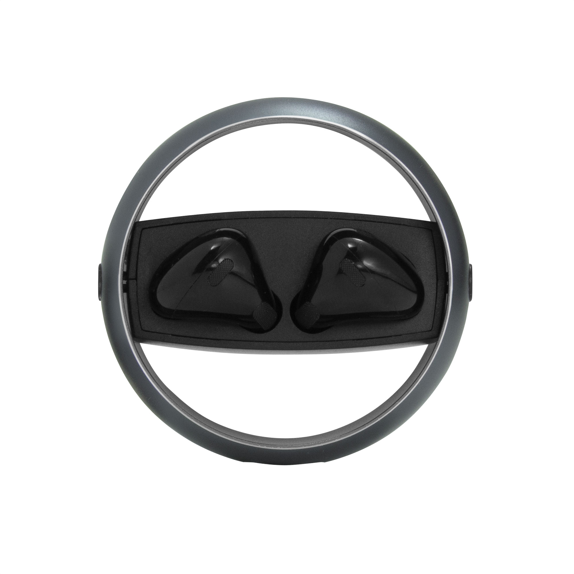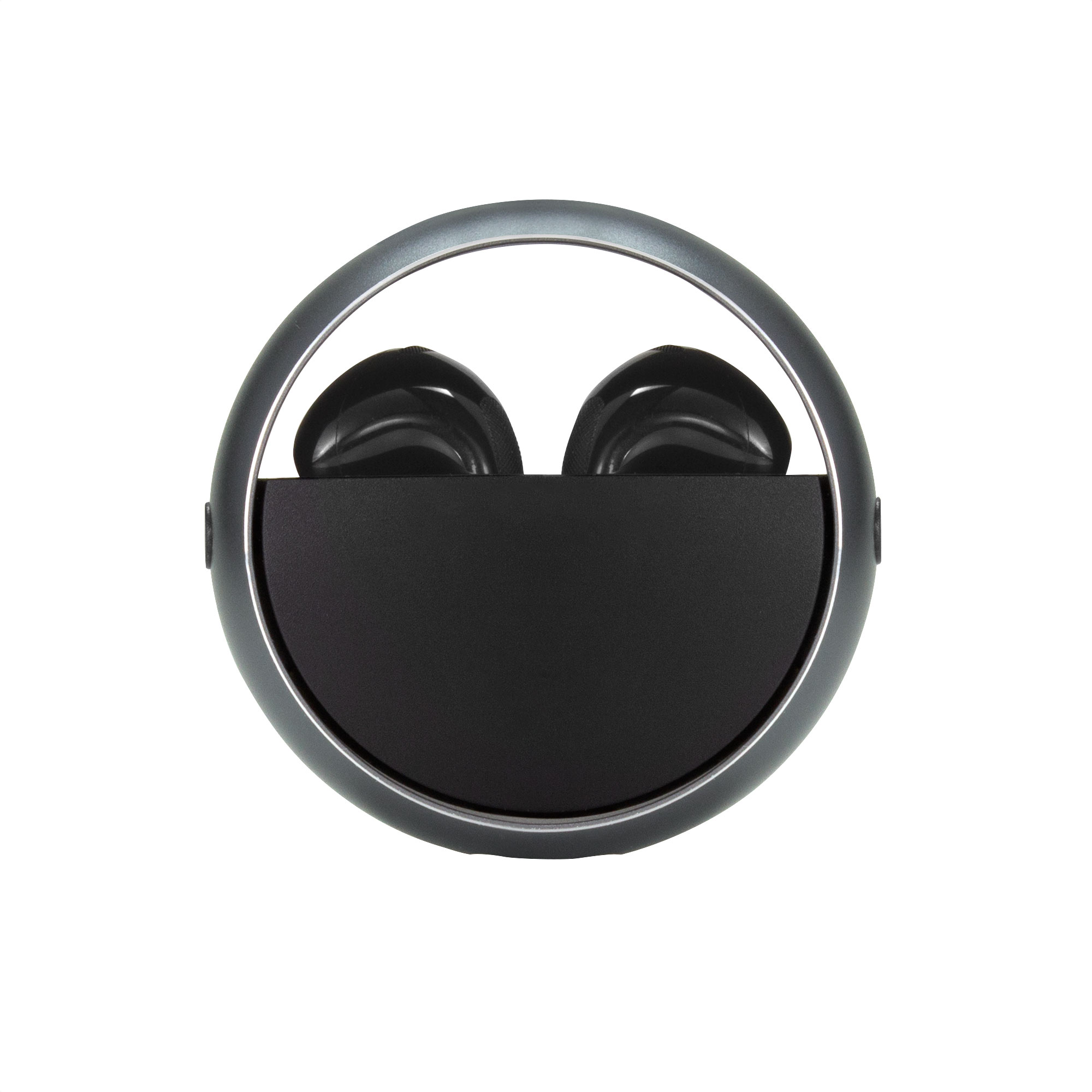Auriculares TWS color negro. Sonido de calidad HI-FI. Versión Bluetooth V5.3. Rango de alcance 10 metros (en áerea abierta). Tiempo de reproducción 4 horas. Capacidad de la bateria: 25 mAh para los auriculares, 230 mAh para el estuche de carga. Los auriculares se colocan en el estuche de carga con marco de aluminio giratorio. Accesorios: cable de carga USB tipo C en color negro. Incluye manual de usuario.