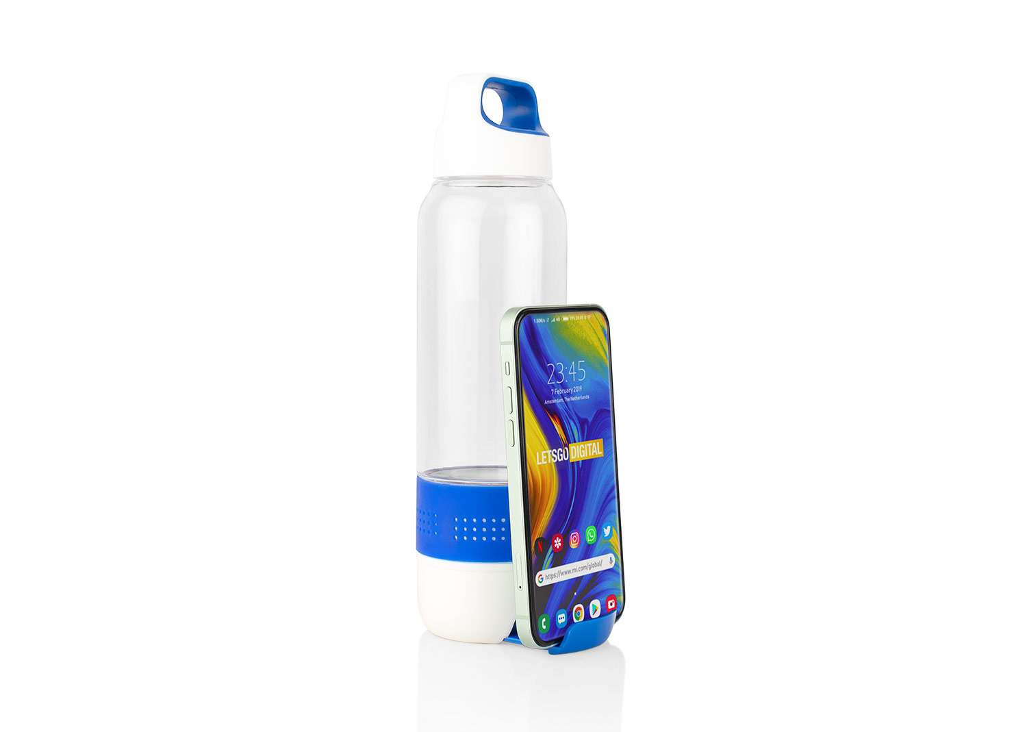 Botella deportiva fabricada en RPET con tapa de plástico de cierre giratorio. Incluye una toalla deportiva (78 X 21,4) en su interior, alojada en un compartimento inferior que también funciona como holder para celular, con sistema de cierre giratorio. Además, cuenta con una banda texturizada en el cuerpo de la botella que mejora el agarre durante su uso. Ideal para entrenamientos y actividades al aire libre. Capacidad: 500 ml / 17 Oz.