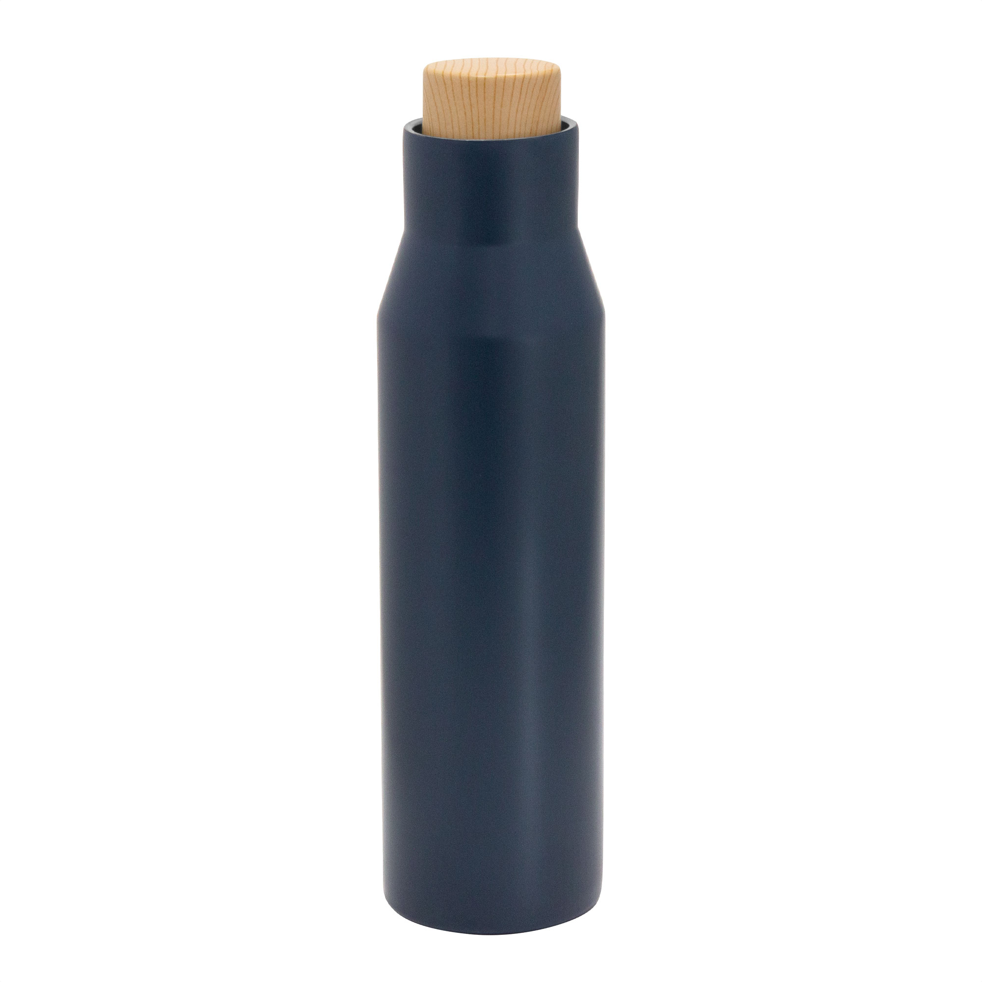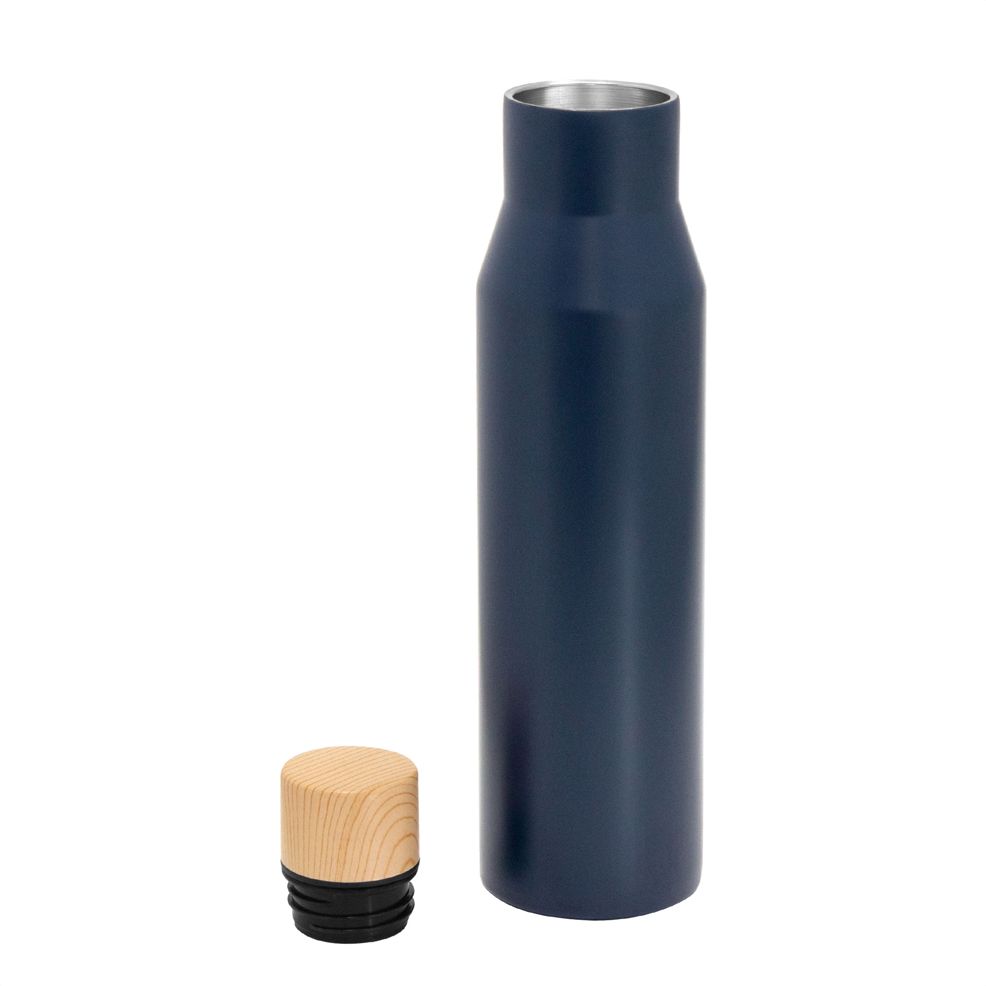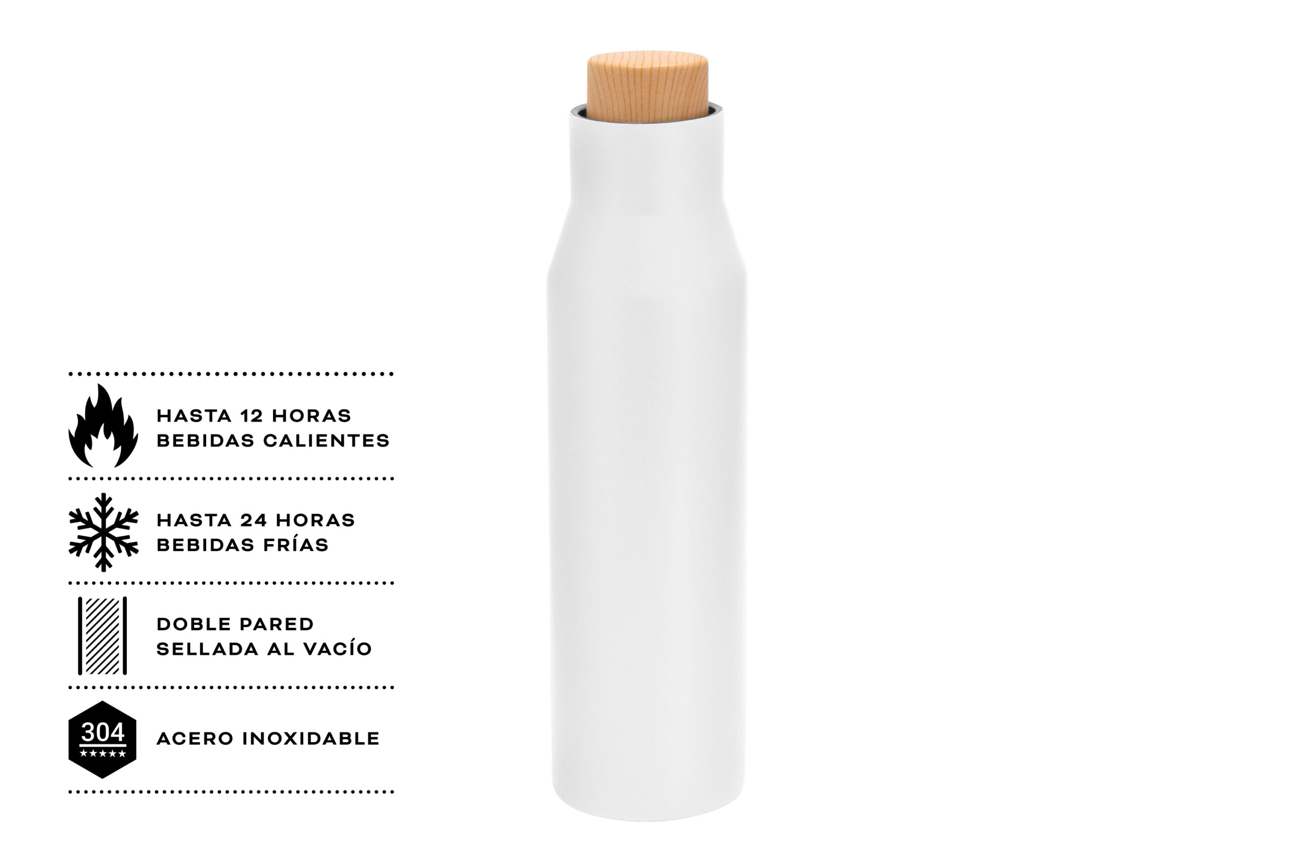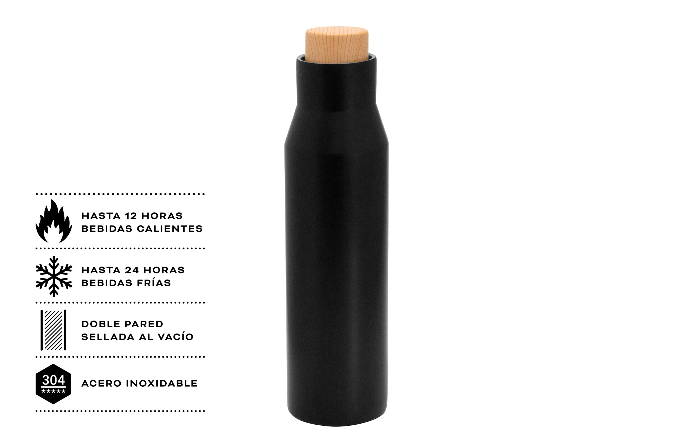 Botella doble pared, sellada al vacío, con aislamiento térmico vacuum. Interior y exterior de acero. Pintura acabado mate. Tapa a rosca con anillo de silicona, interior de acero y exterior en polipropileno imitación bambú. Mantiene por más de 12 hs la temperatura de las bebidas calientes y 24 hs de las bebidas frías.