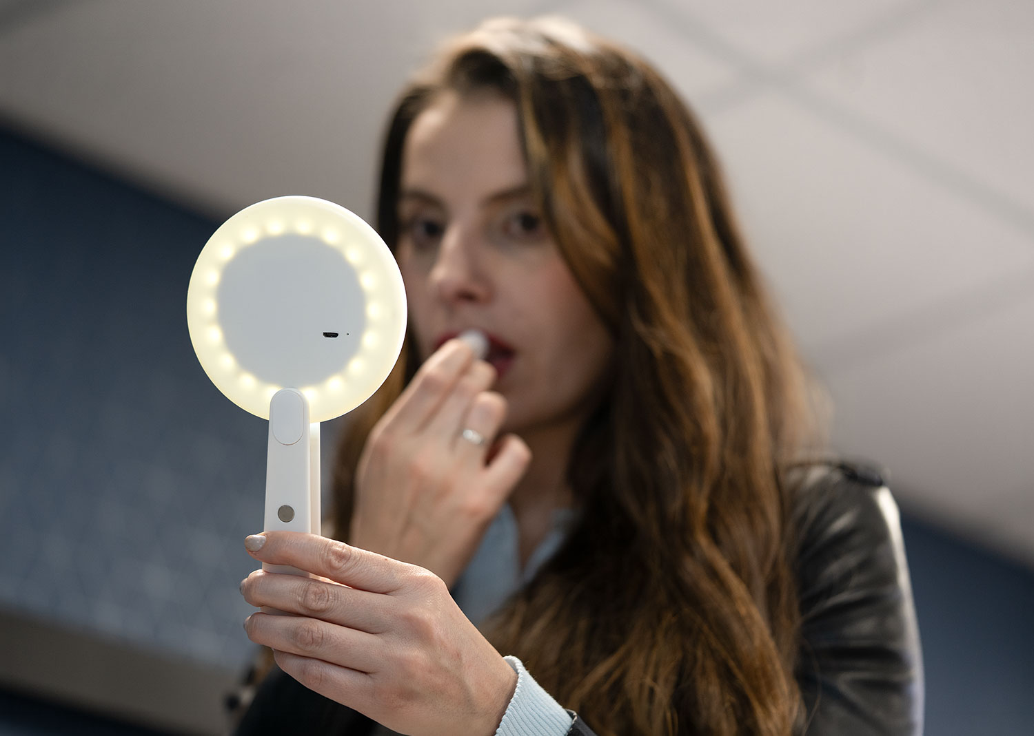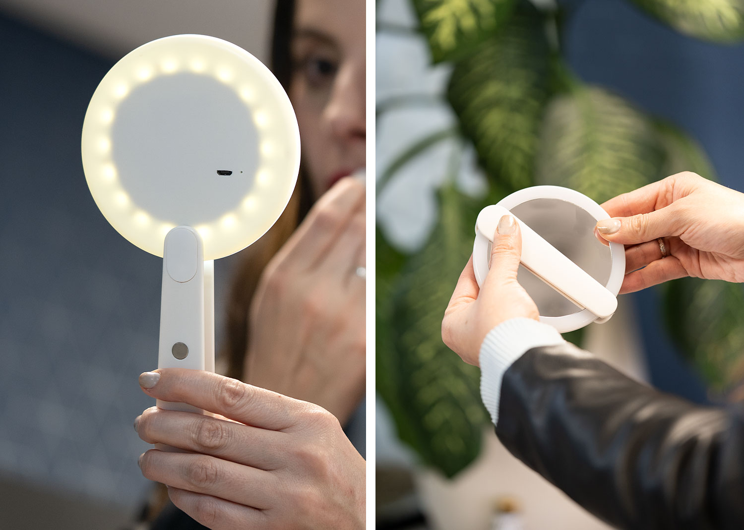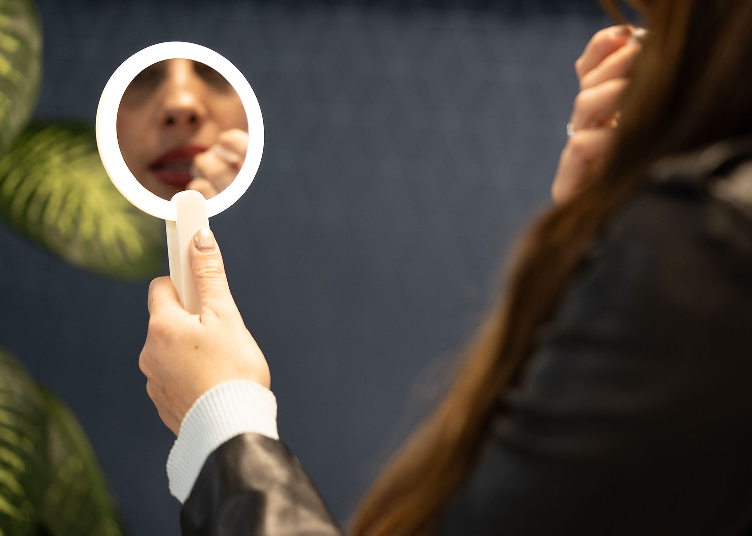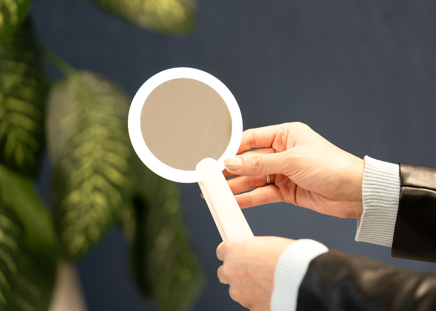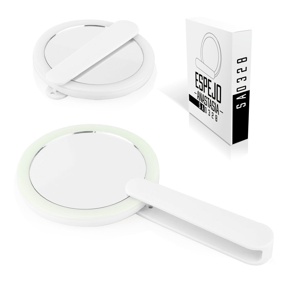 Espejo de maquillaje plegable con luz LED integrada. Cuenta con una sola luz que se activa al mover el agarre hacia un lado y se apaga automáticamente al plegar el espejo. Su diseño compacto lo hace ideal para llevar en el bolso o usar en espacios reducidos, ofreciendo iluminación práctica para retoques precisos.