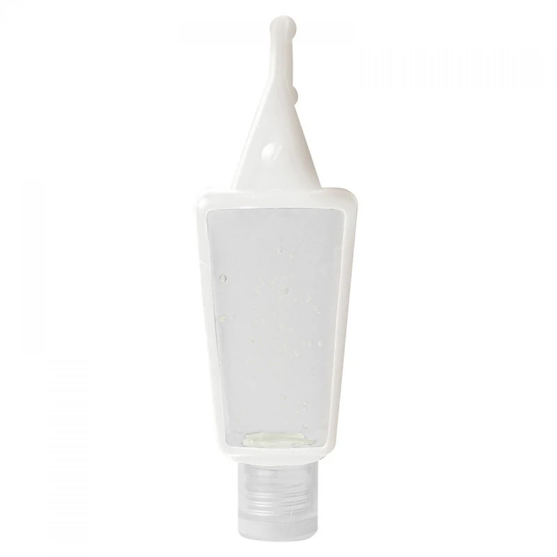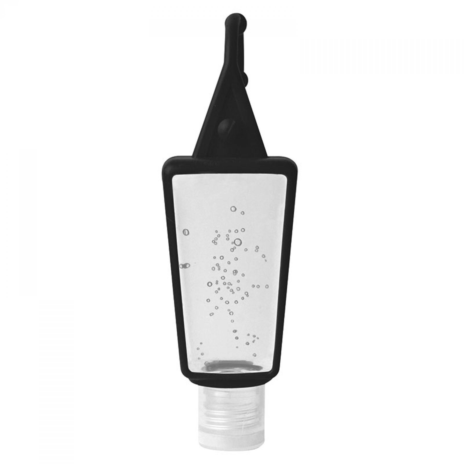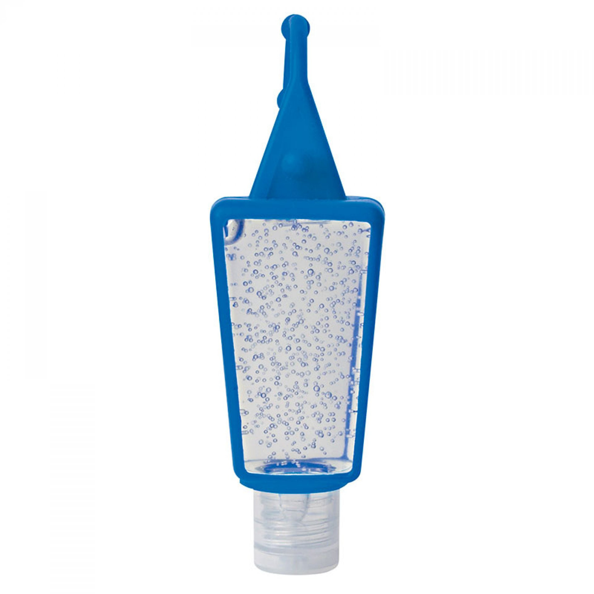 Recipiente plástico con gel antibacterial y estuche siliconado para colgar. 30 ml. Tamaño: 7,8 x 3,5 cm.