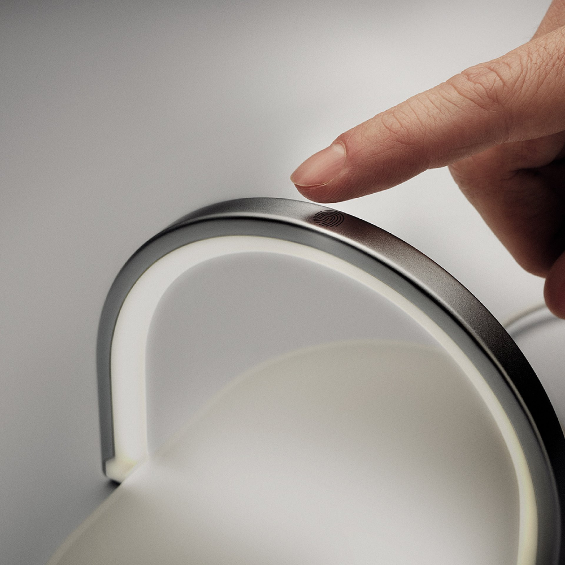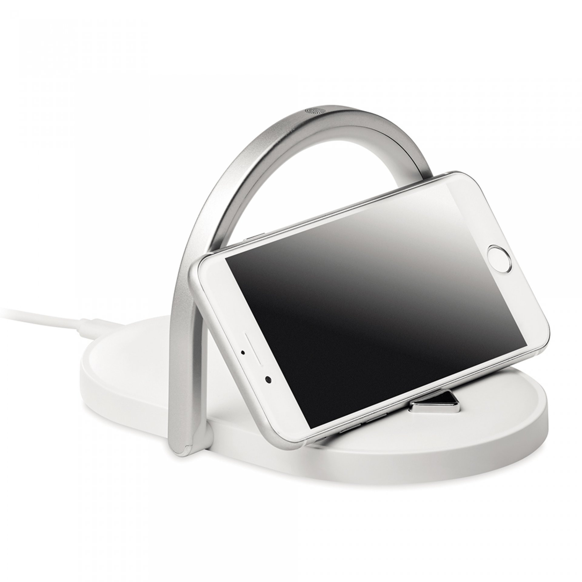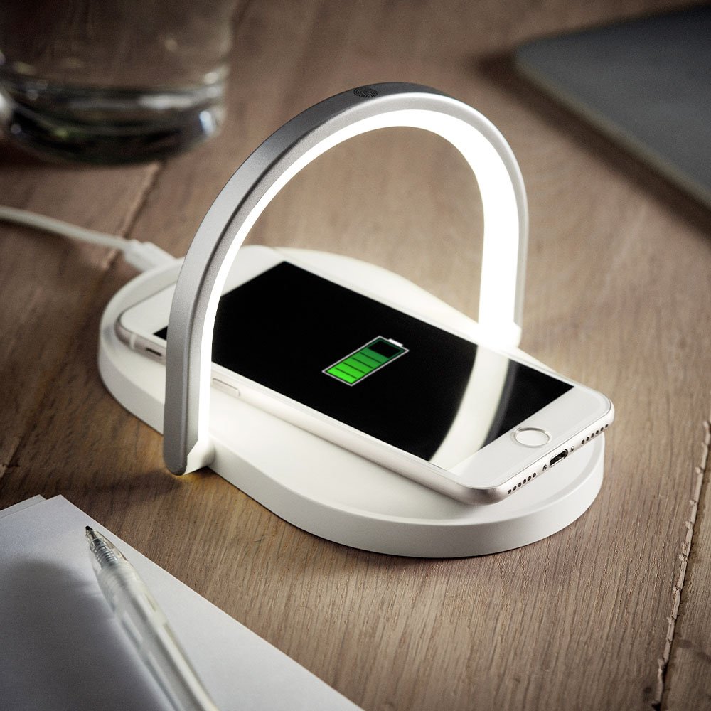 Lampara de mesa touch de 3 niveles con barra en aluminio. Soporte para celular. Carga inalámbrica rápida de 15 W. 9V. Cable tipo C incluido.