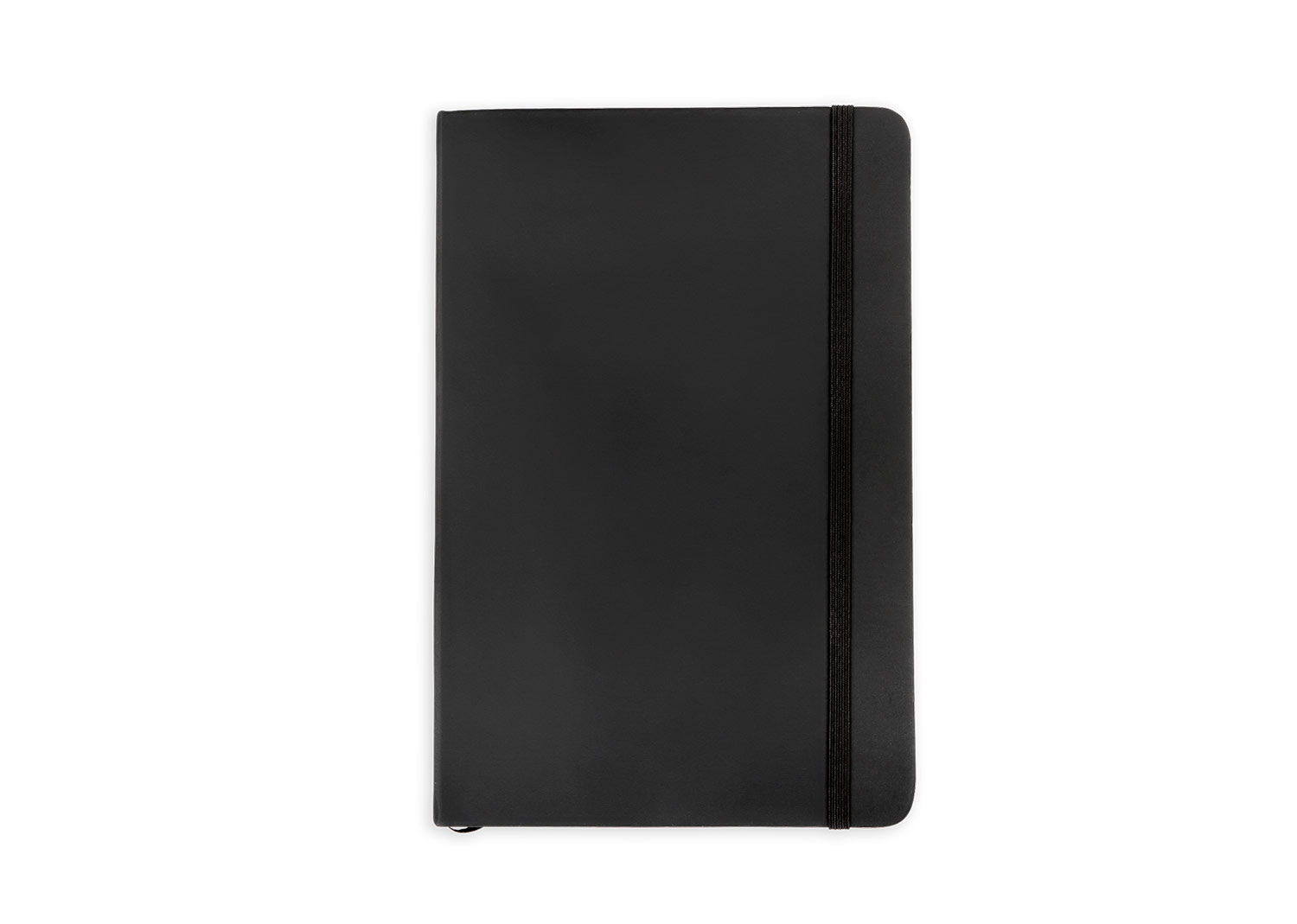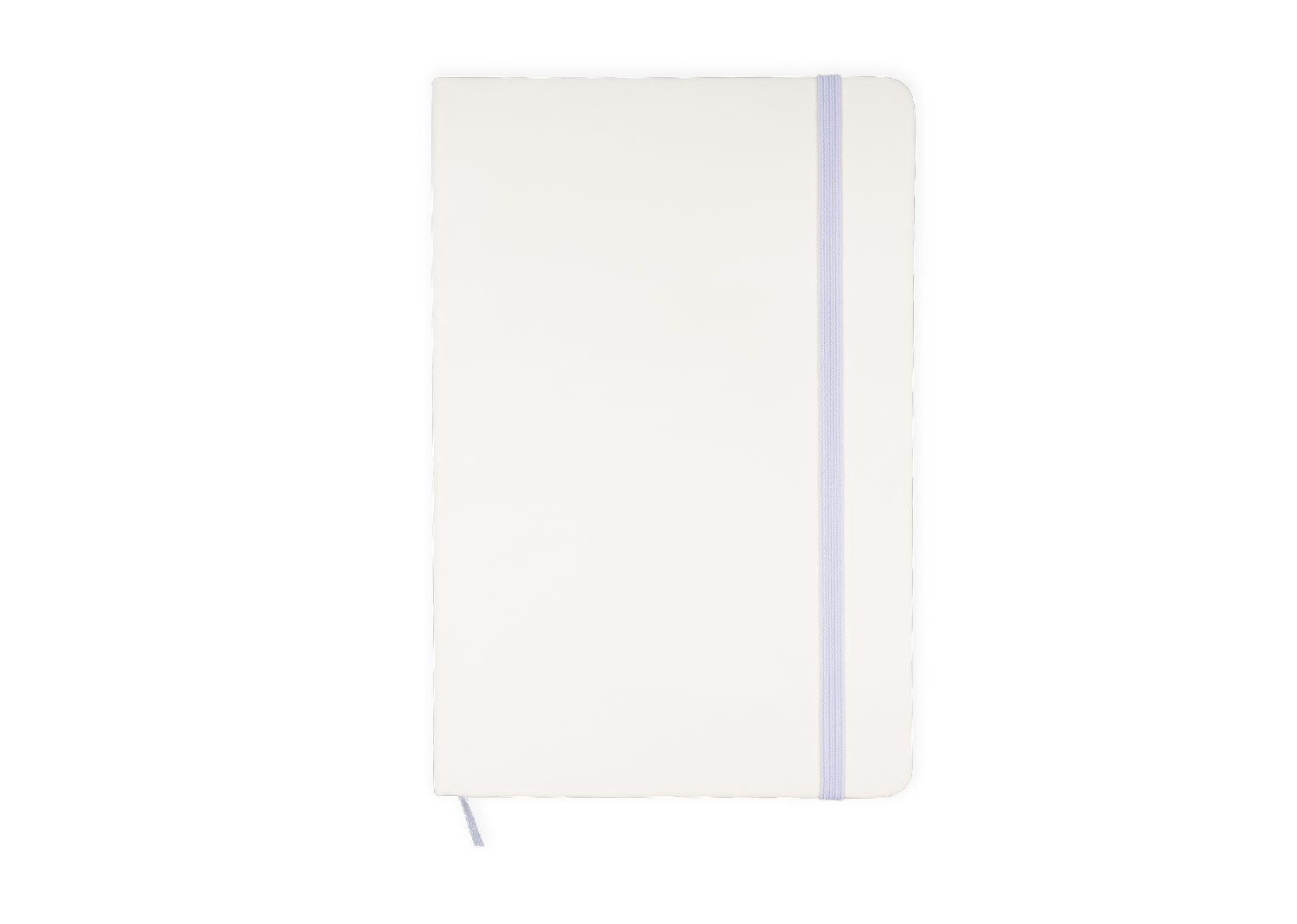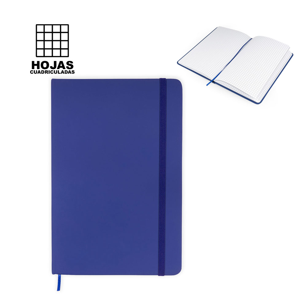 Libreta con cubierta forrada en imitación de cuero. Con banda elástica de cierre y cinta separadora. Contiene 80 hojas cuadriculadas. Tamaño aproximado de la hoja: A5.