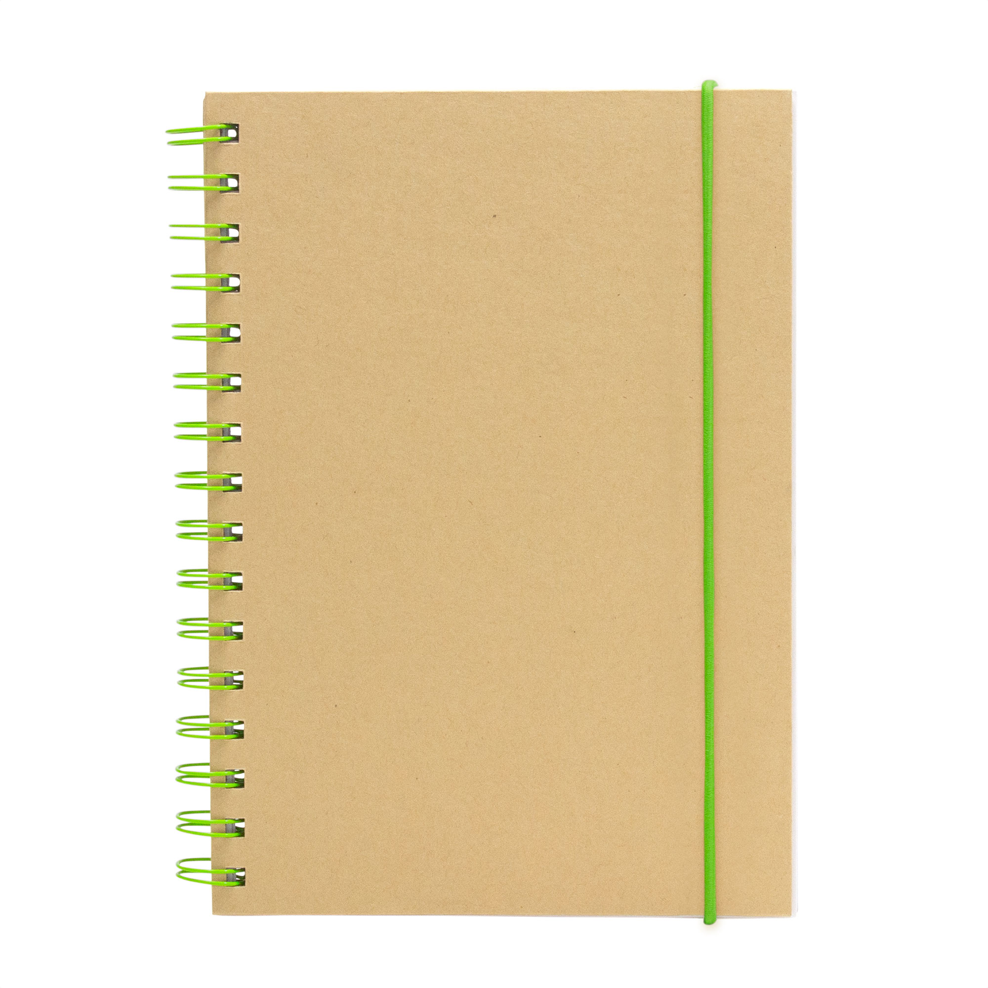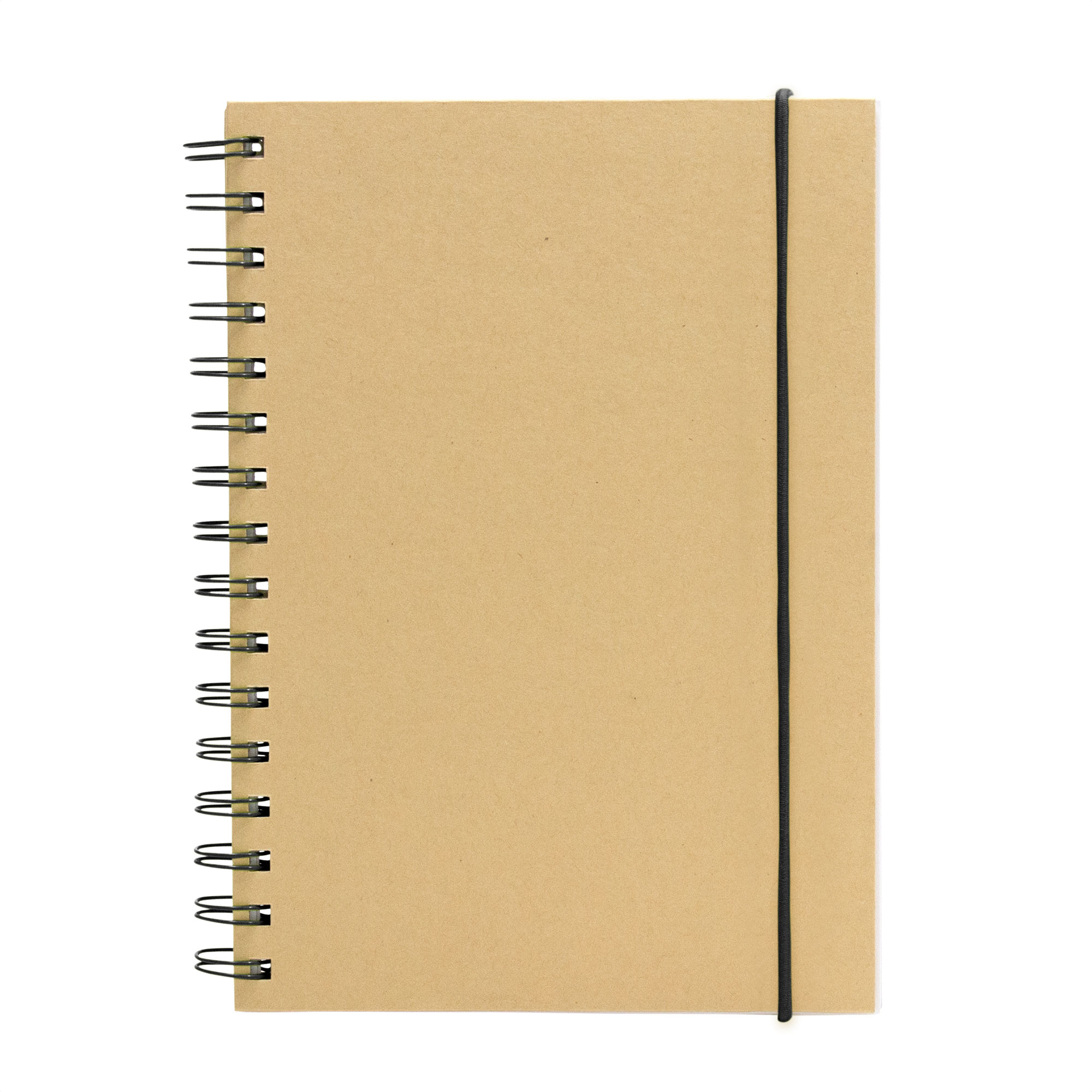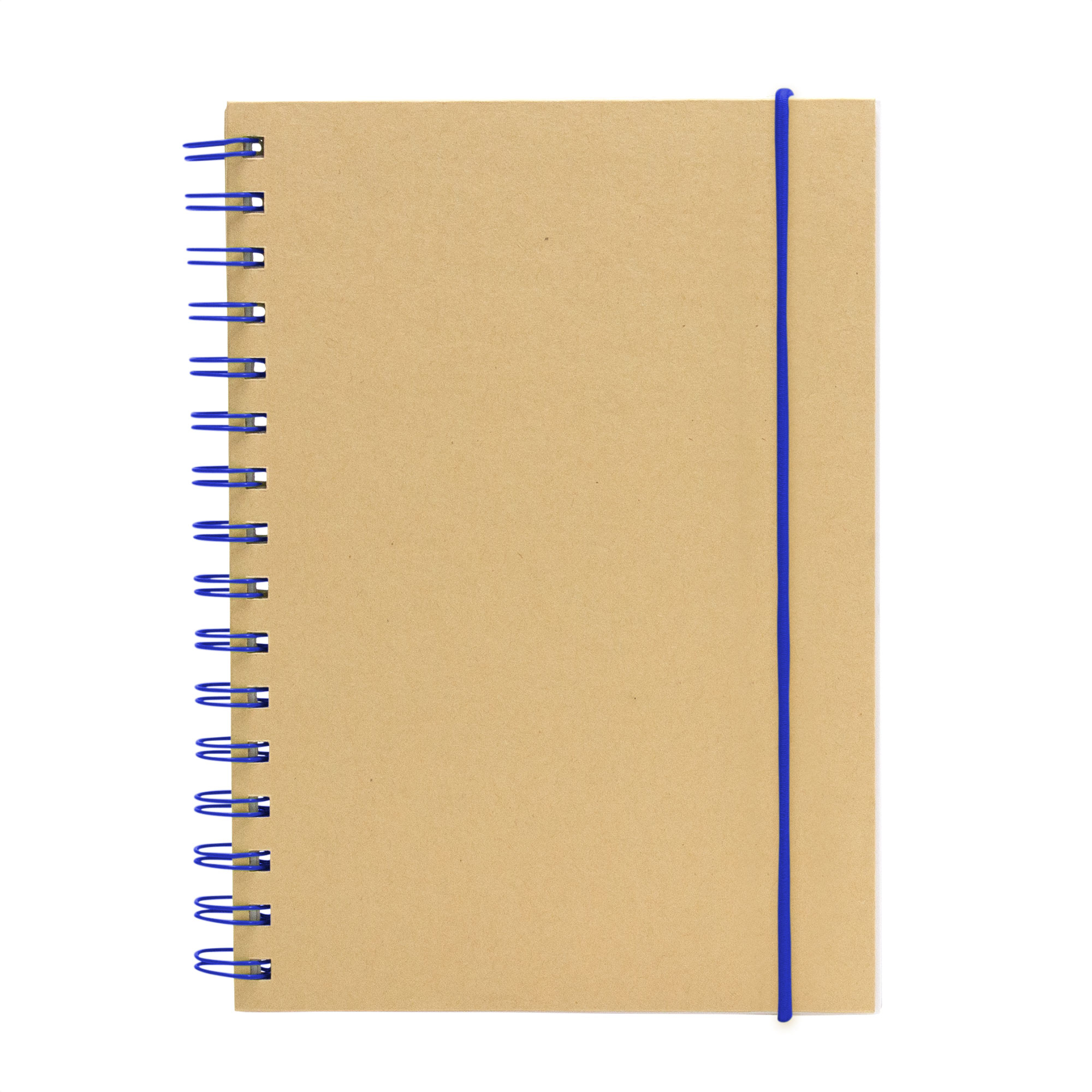 Libreta espiralada. Tapa recubierta en papel Kraft de 120 g. Interior de 70 hojas blancas rayadas de 80 g. Cierre con banda elástica y espiral del mismo color.