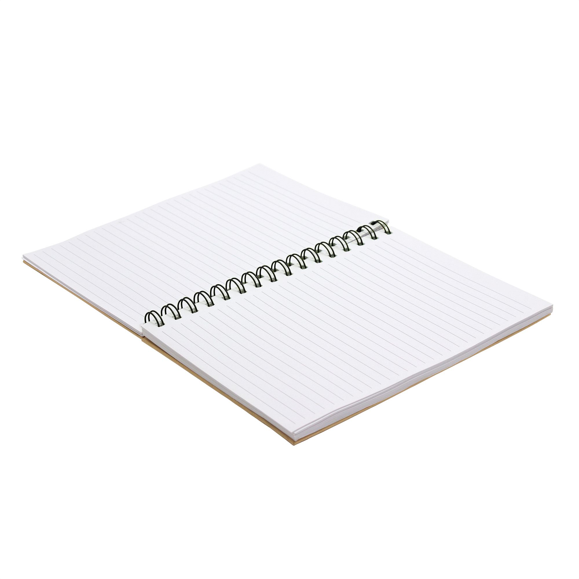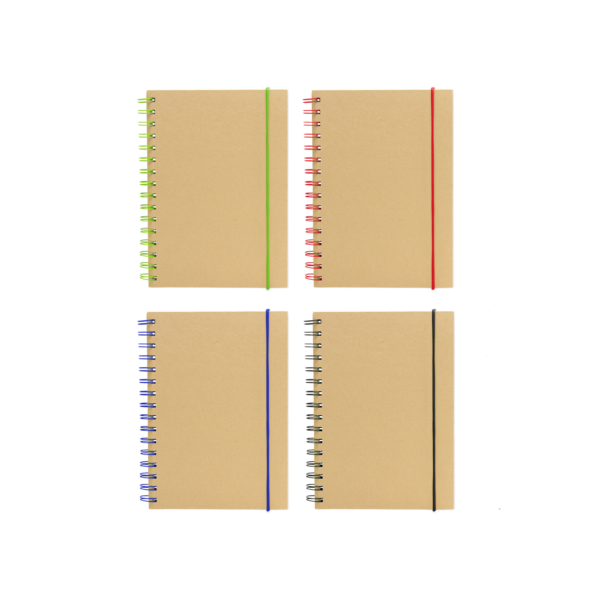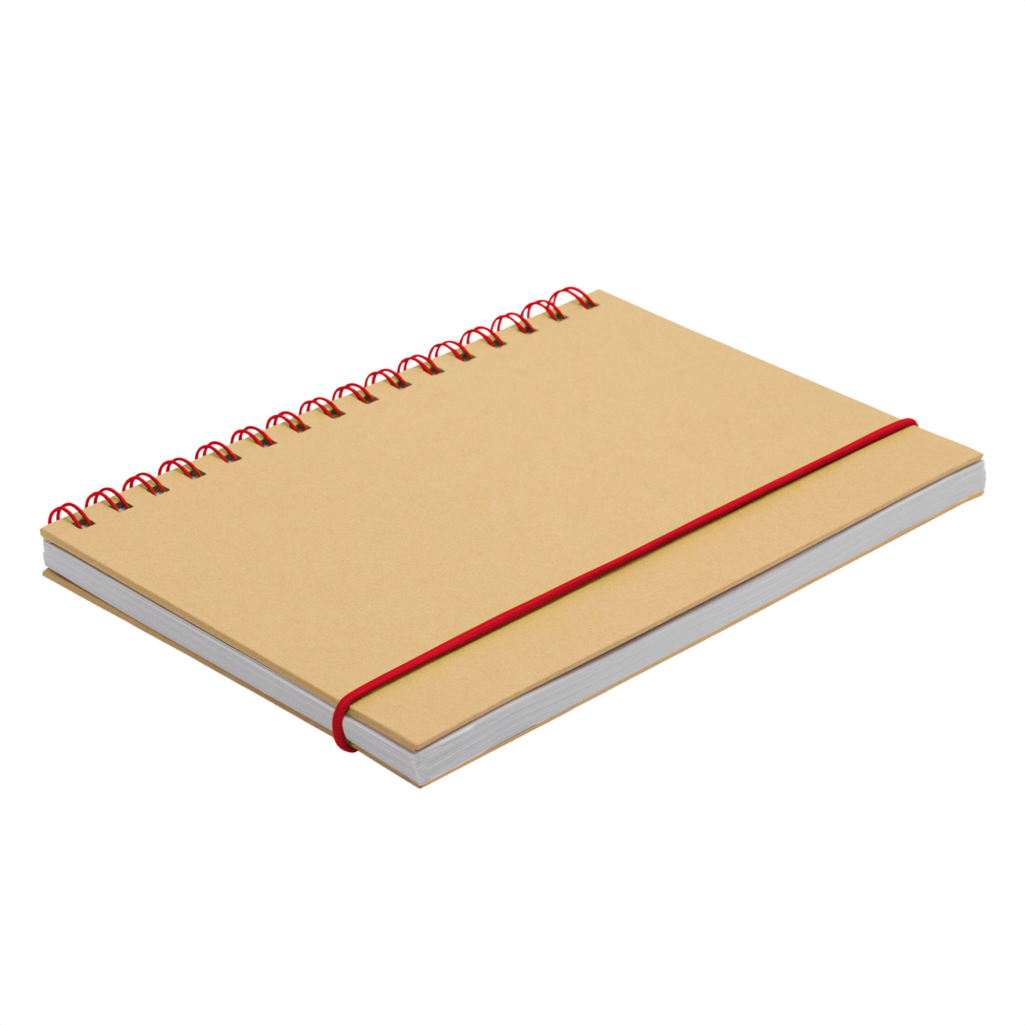 Libreta espiralada. Tapa recubierta en papel Kraft de 120 g. Interior de 70 hojas blancas rayadas de 80 g. Cierre con banda elástica y espiral del mismo color.