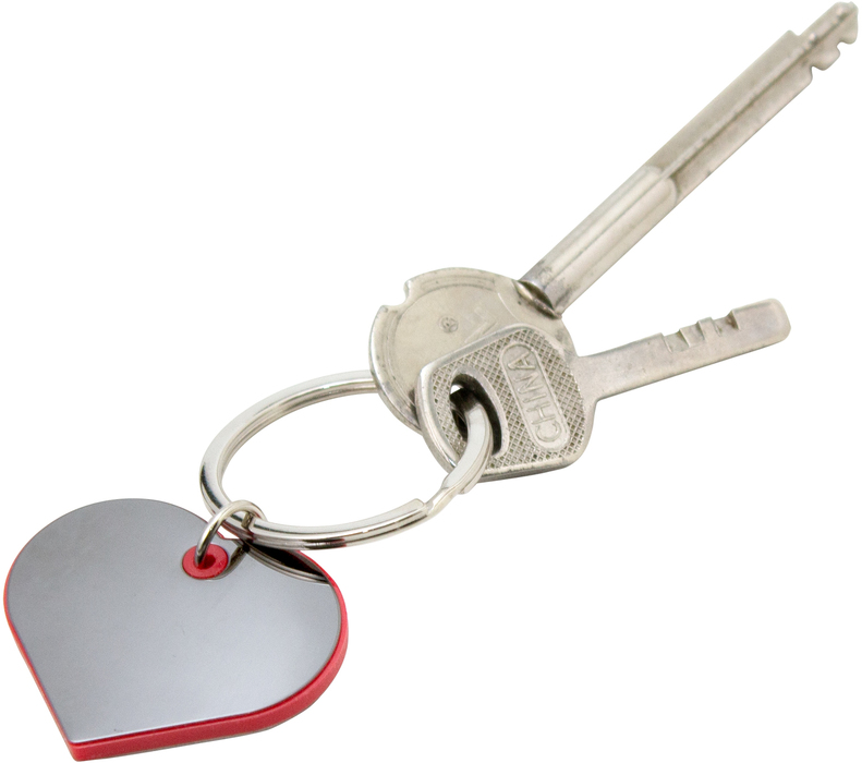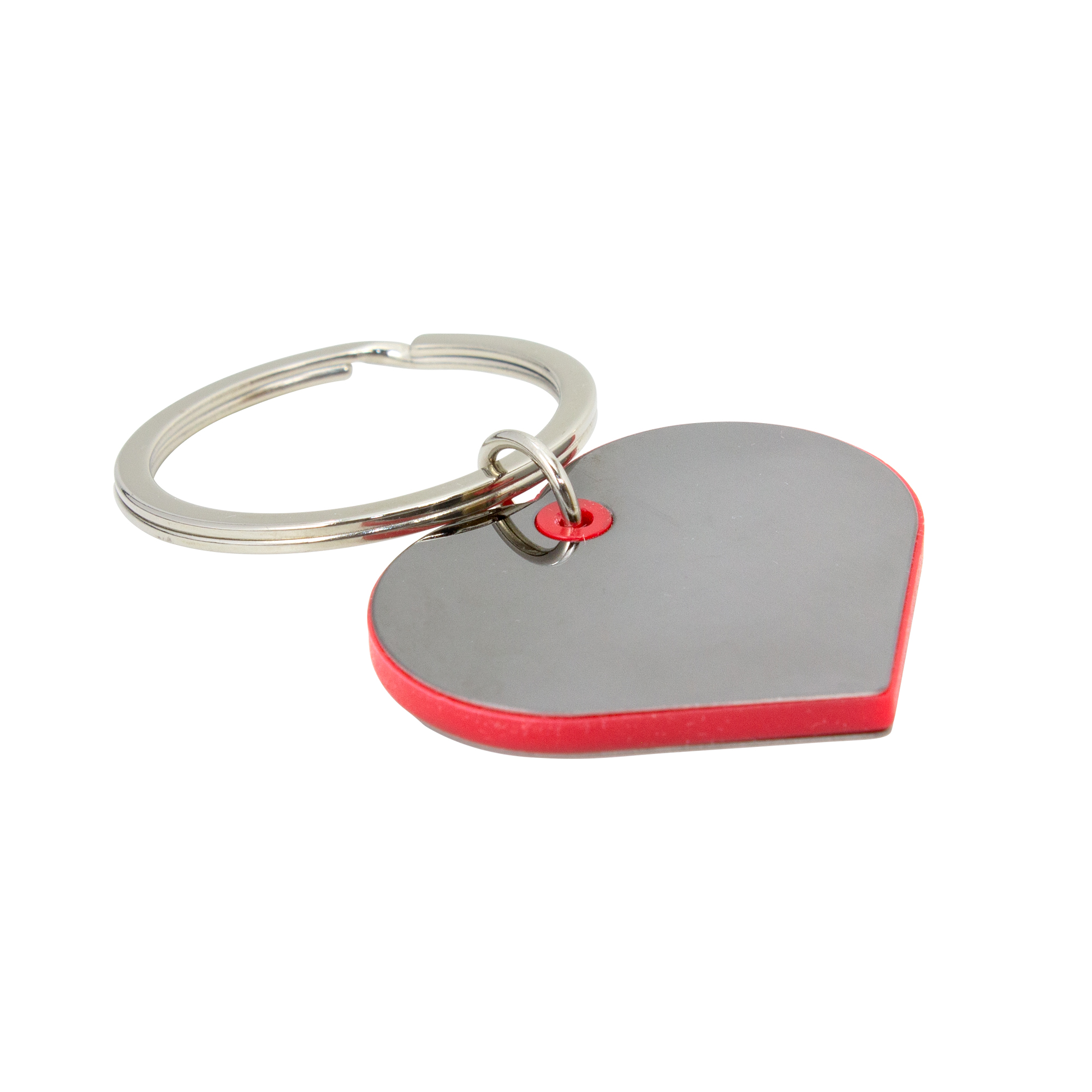 Llavero con forma de corazón. Estructura plástica de color con apliques de acero color gris gun de cada lado. Acabado brillante.
