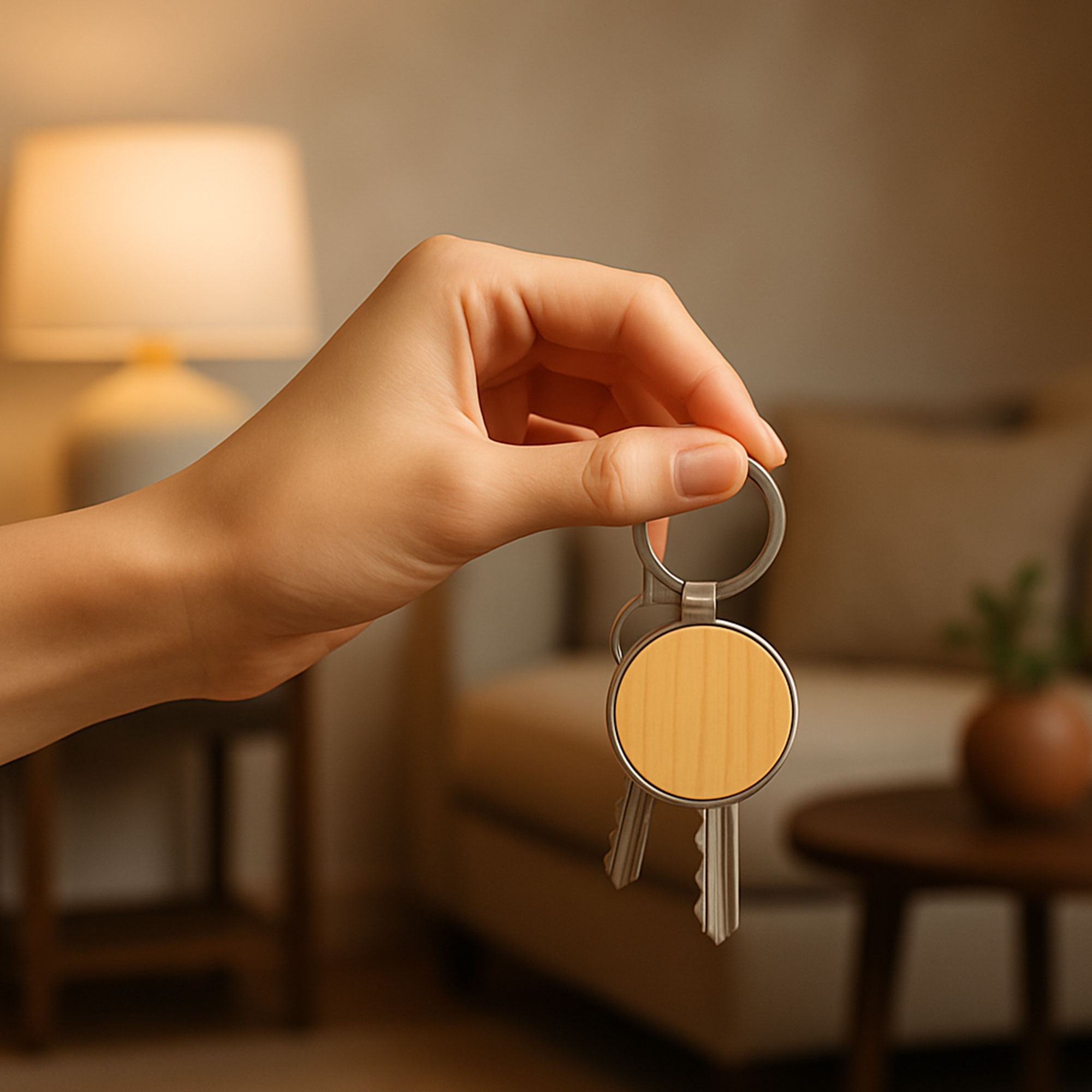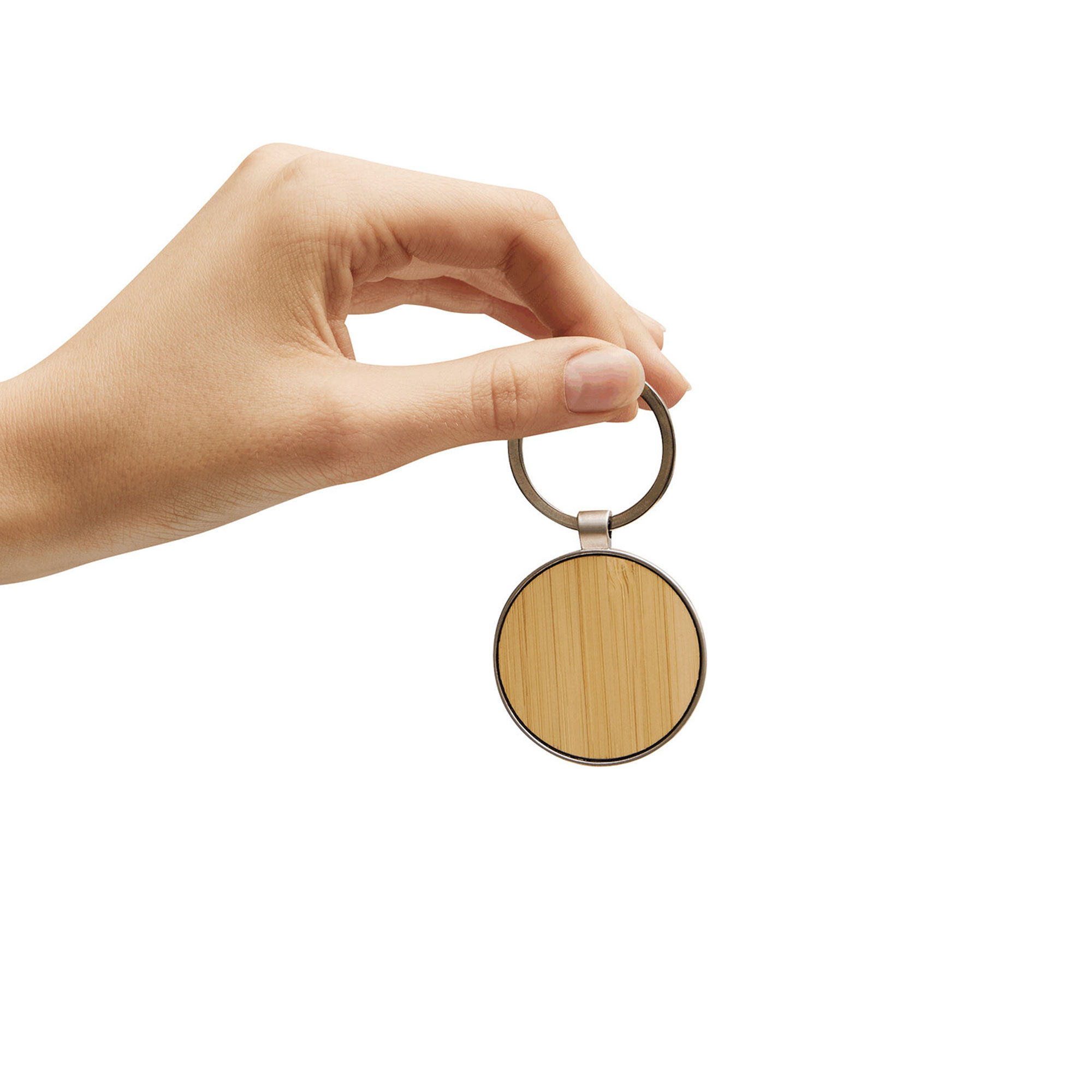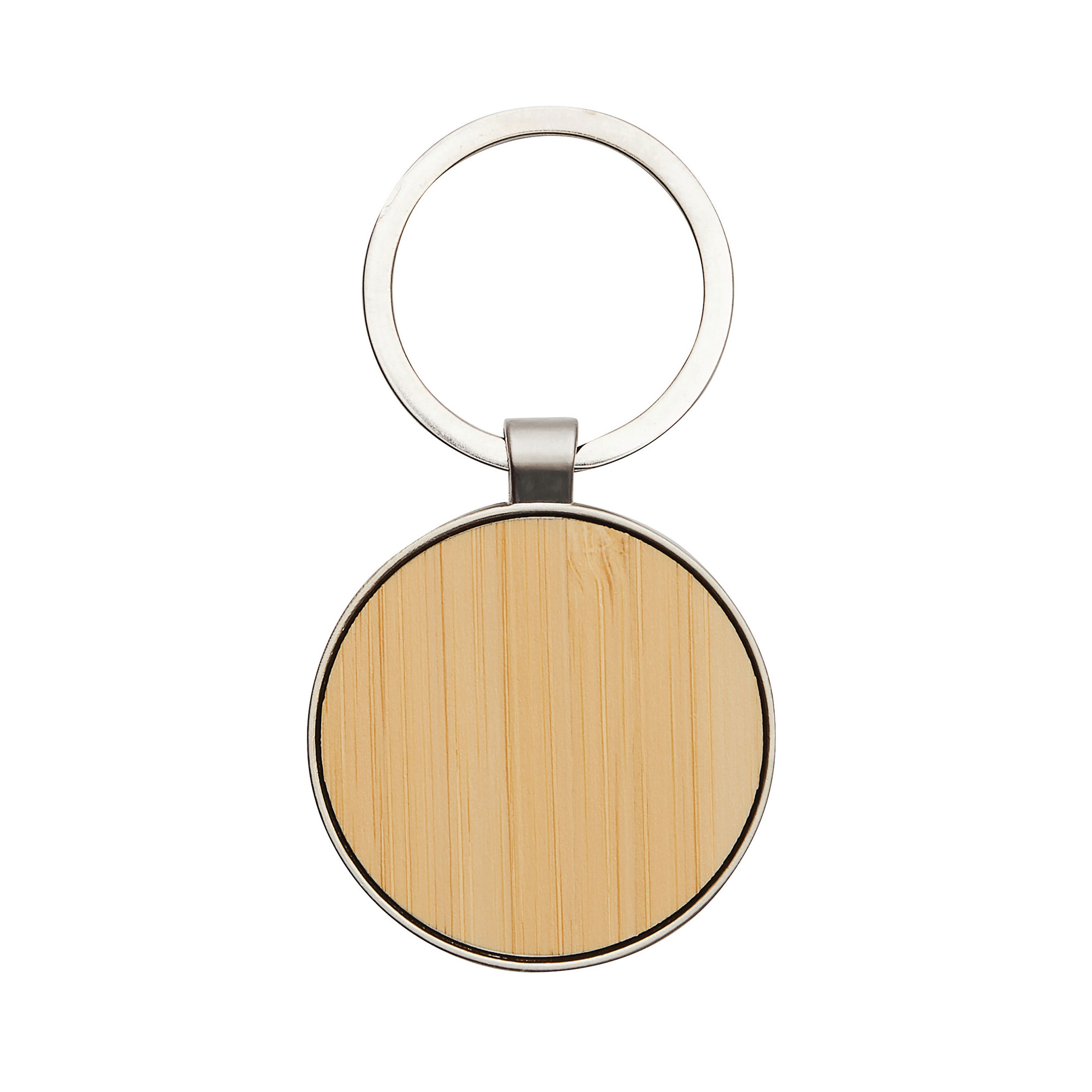 Llavero con forma circular. Estructura metálica con aleación de zinc con acabado brillante y panel frontal de bambú barnizado.