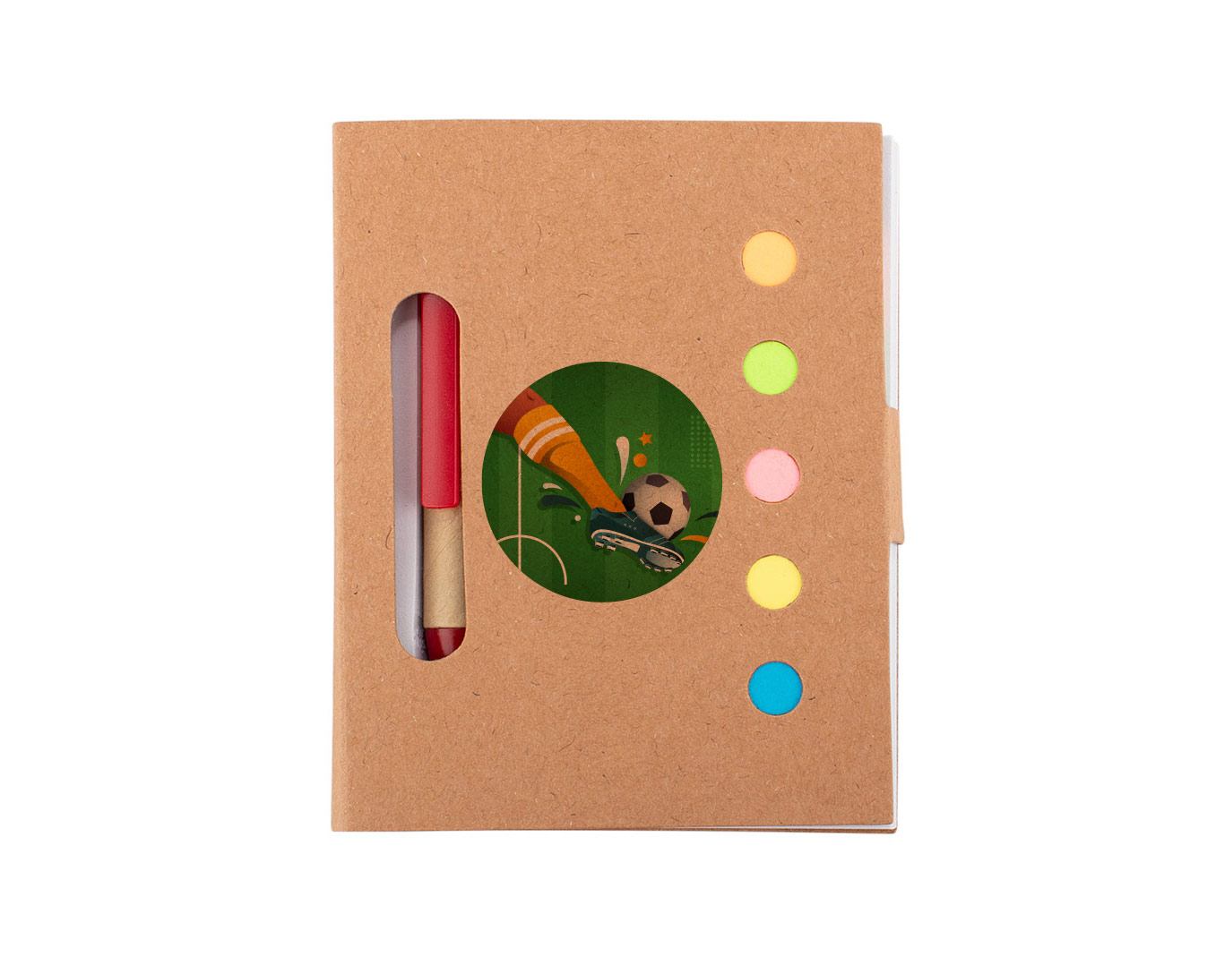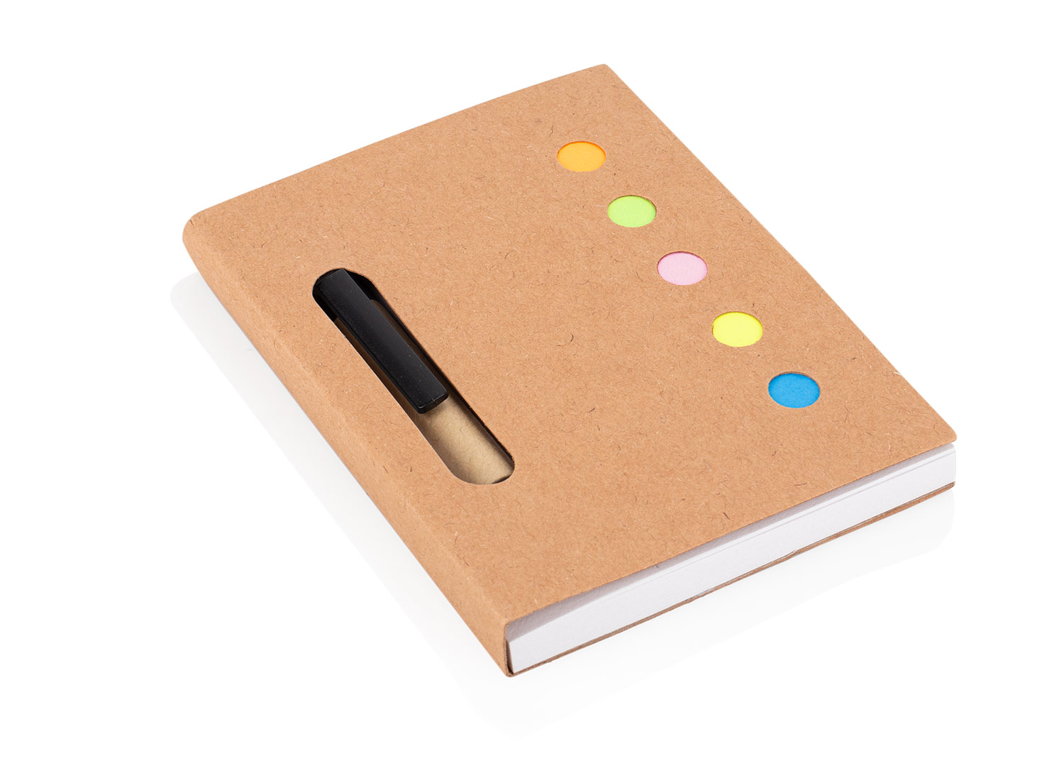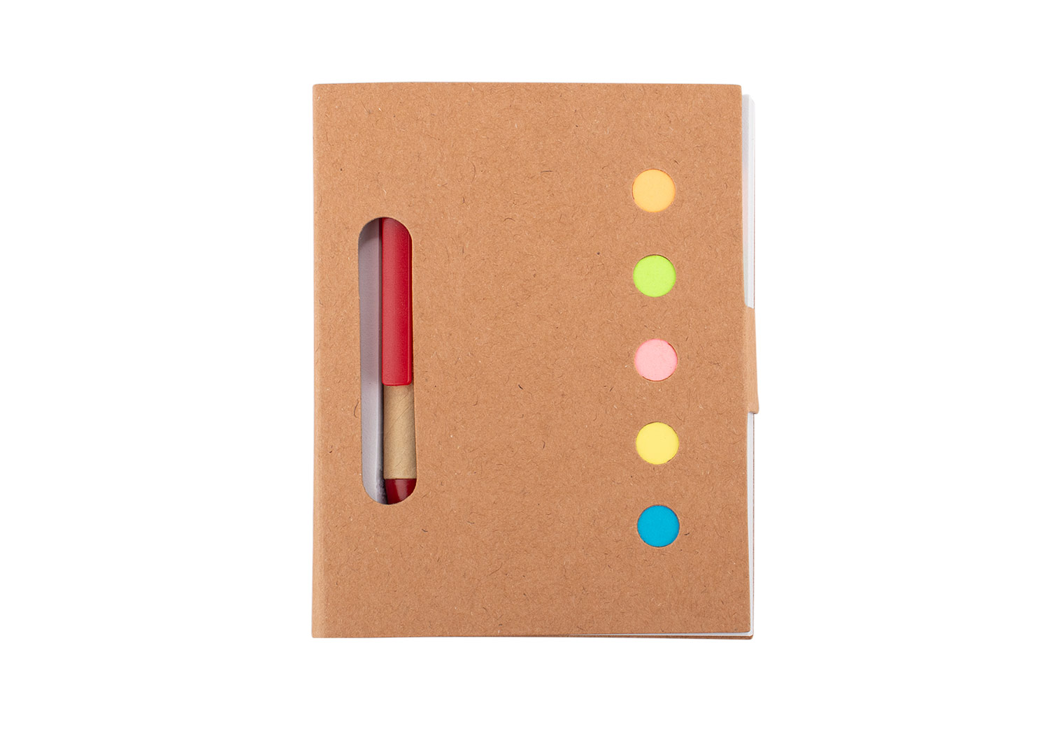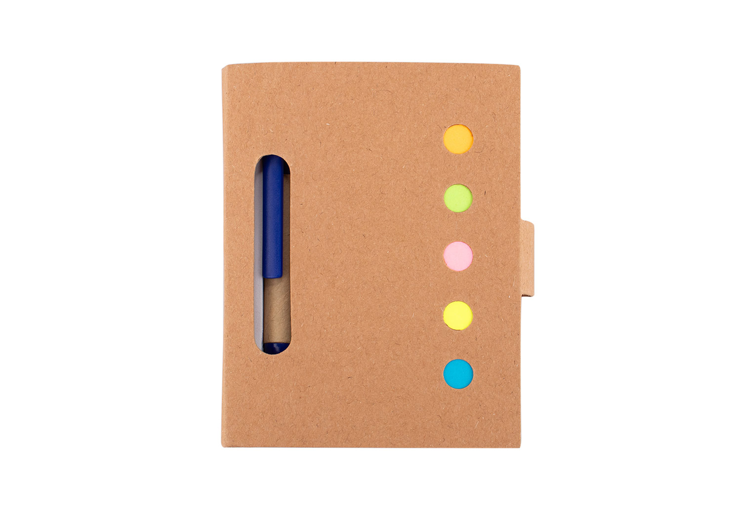 Organiza tus ideas con estilo y funcionalidad. Este práctico set incluye portada y contraportada elaboradas en papel artesanal, que aportan un toque ecológico y elegante. En su interior encontrarás 5 colores de notas adhesivas (25 hojas c/u) para destacar lo importante, junto a 80 hojas de 70 g/m², fáciles de desprender para tus apuntes diarios. Además, incorpora un bolígrafo (8,5 X Ø 0,8 X 1,1) con barril de papel, clip y mecanismo retráctil, ideal para escribir cómodamente en cualquier momento. ¡Un aliado perfecto para tu escritorio o para llevar contigo a todas partes!