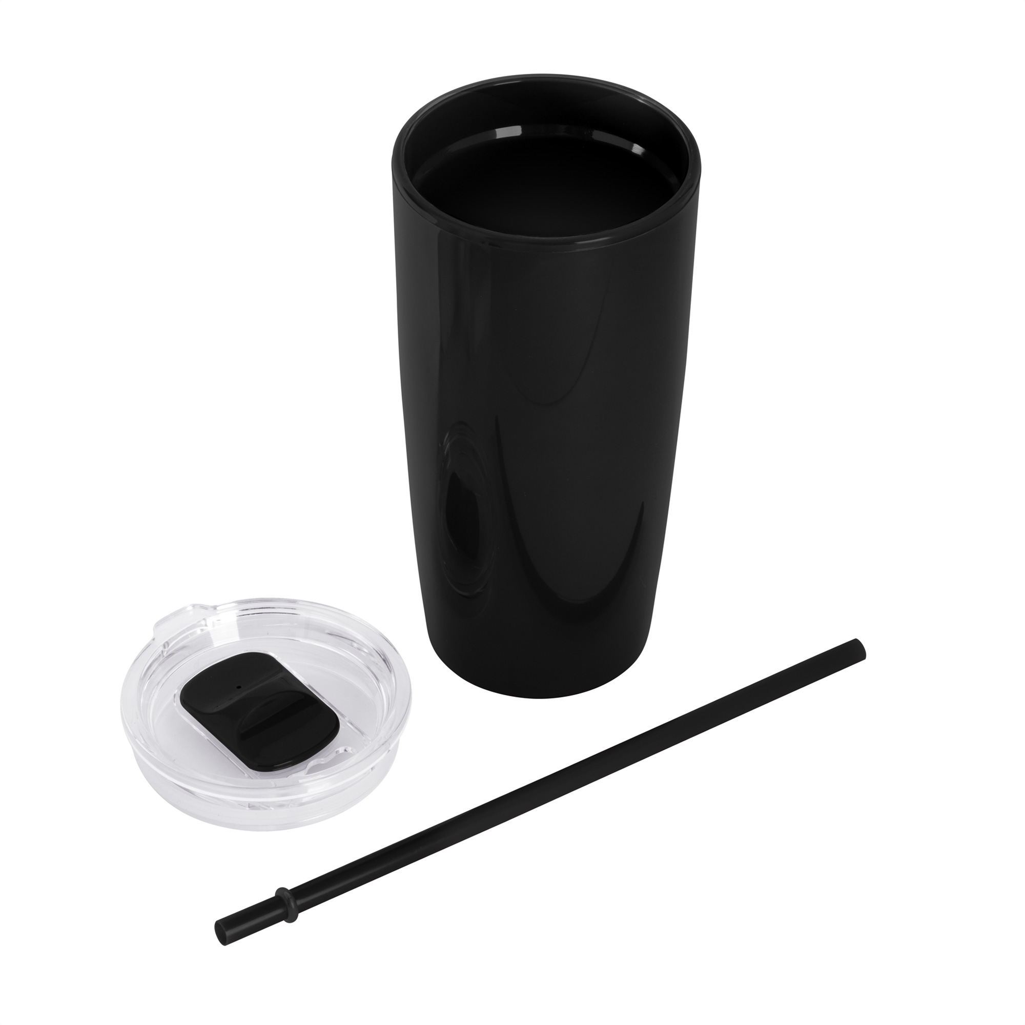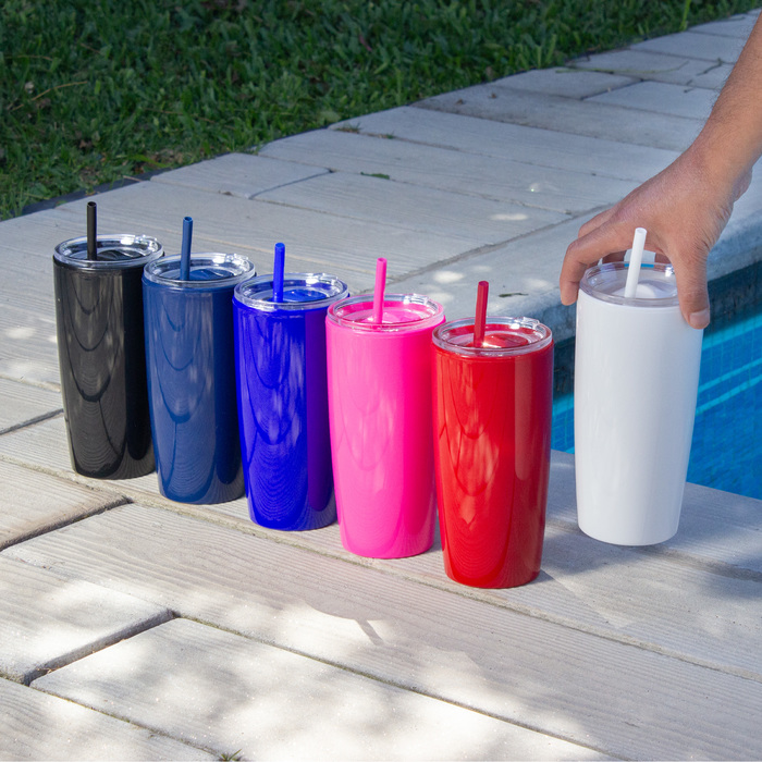 Mug doble pared con sorbete. Tapa plástica transparente a presión con anillo de silicona. Sorbete de polipropileno y cierre deslizante del mismo color que el cuerpo. Cuerpo con acabado brillante. Capacidad: 600 ml.
