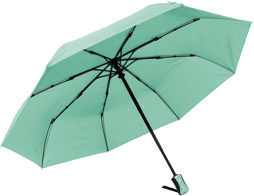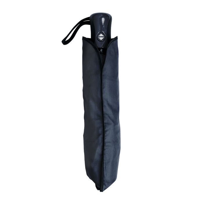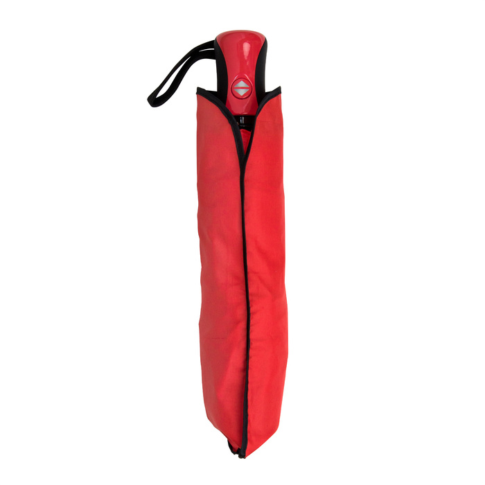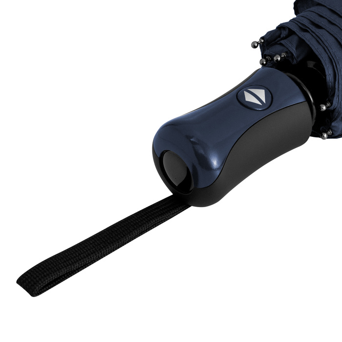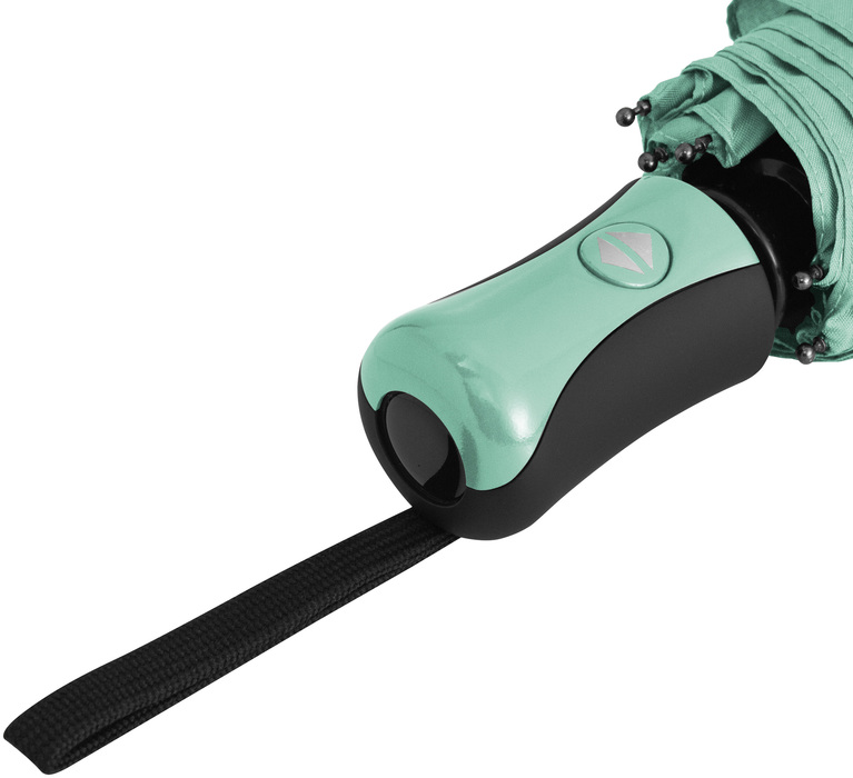 Paraguas APERTURA Y CIERRE AUTOMATICO. Eje metálico de color negro y varillas de fibra. Mango de plástico engomado con revestimiento de poliuretano color negro y detalles en color a tono con la tela, acabado brillante. Correa cordón color negro. Botón a presión. Tela con detalles en color negro. Cierre con correa de velcro.
