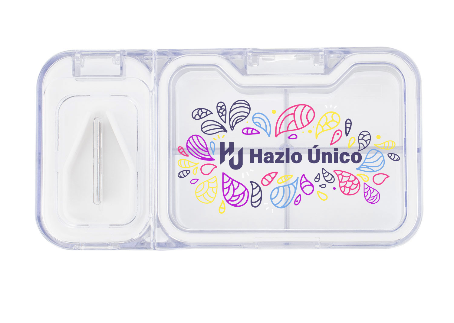 Pastillero elaborado en PP con diseño práctico que incluye cuatro compartimientos de almacenamiento (8,2 X 6,1) y un cortador de píldoras integrado (3,7 X 6,1). Ambos espacios cuentan con cierre a presión, asegurando un manejo seguro y organizado. Ideal para mantener las dosis diarias ordenadas y facilitar el consumo de medicamentos en cualquier momento.