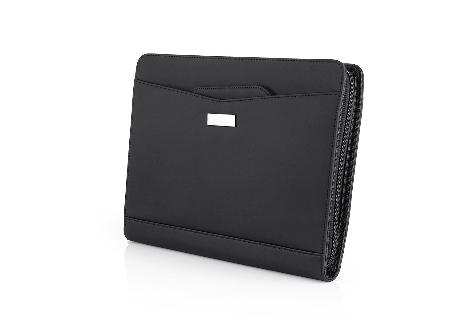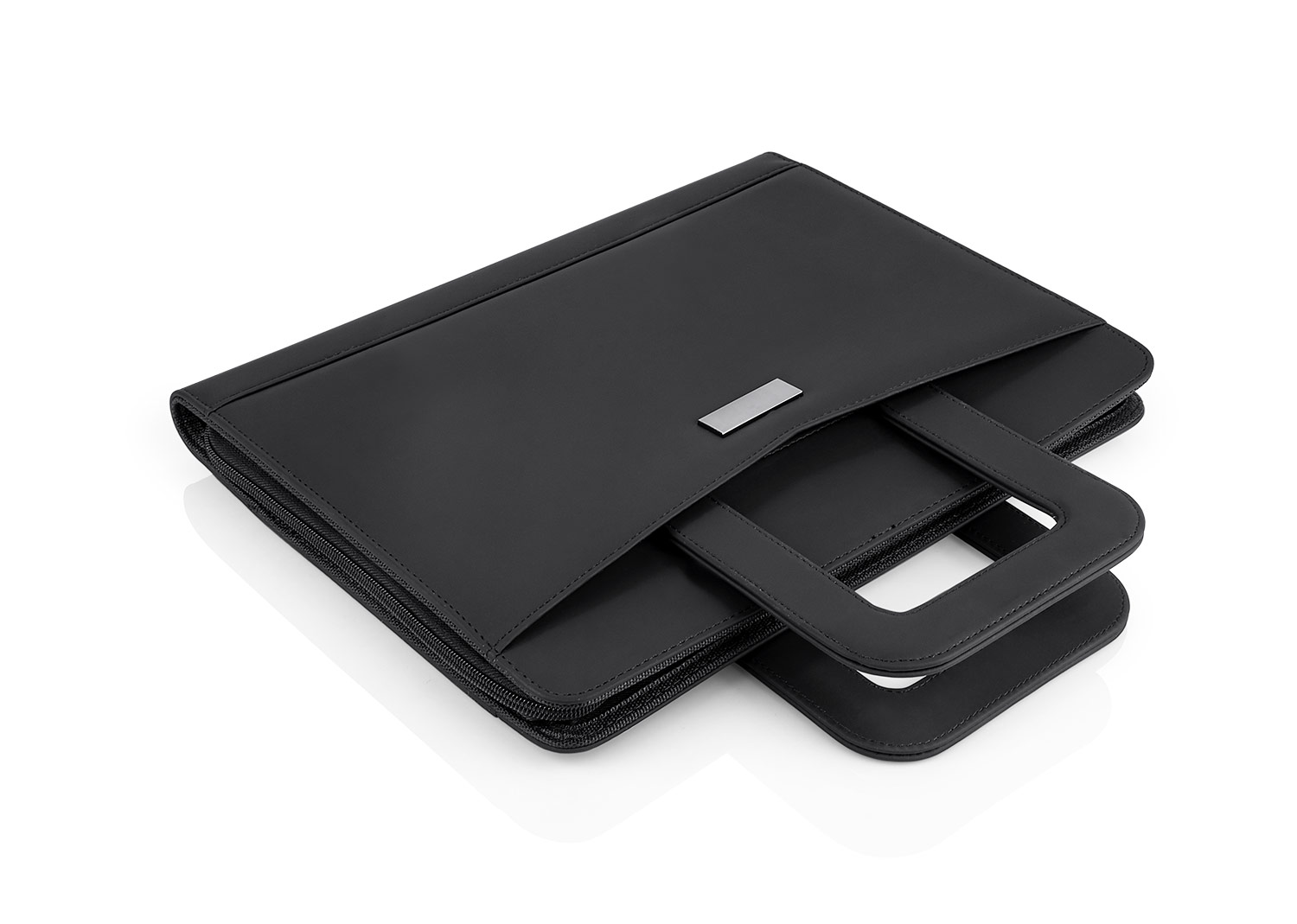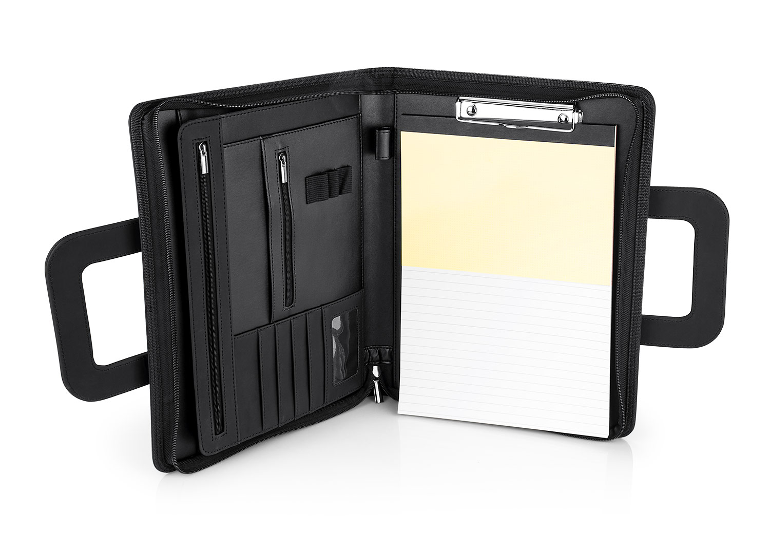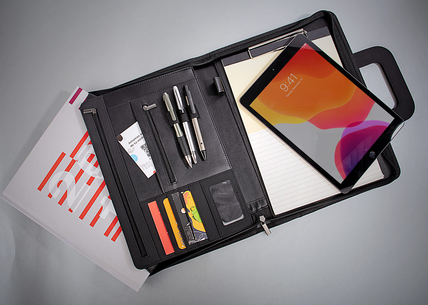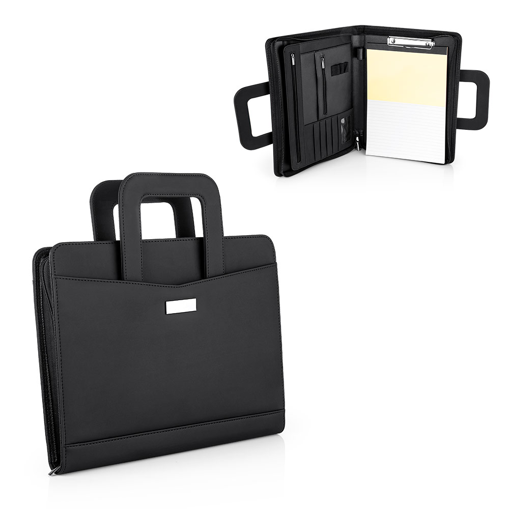 Portafolio en PU, con bloc de notas papel blanco con 30 hojas rayadas, gancho legajador metálico, dos agarrraderas que se ocultan y permiten transportar facilmente, multiples bolsillos para organizar tarjetas de presentación, bolígrafos, calculadoras, bolsillo prinicipal para guardar portatil o tablets de 12″