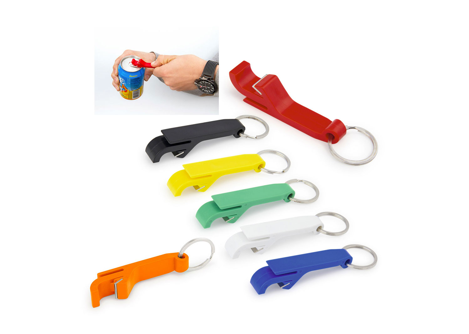 Llavero destapador hecho en plástico durable para abrir botellas y latas de gaseosas.