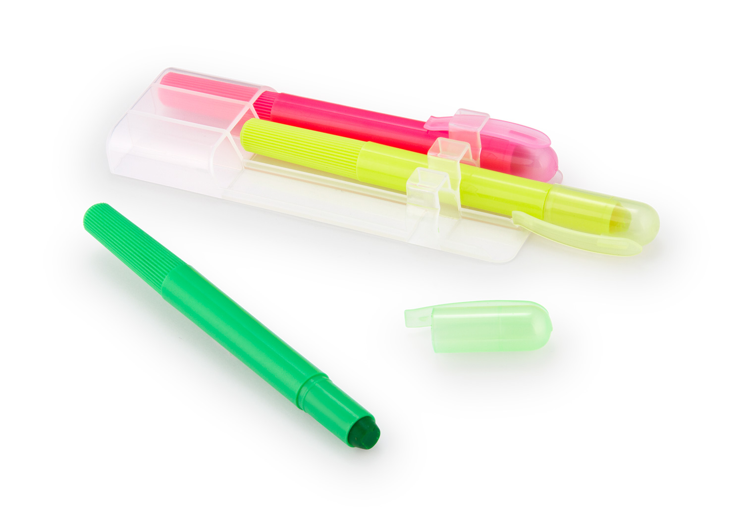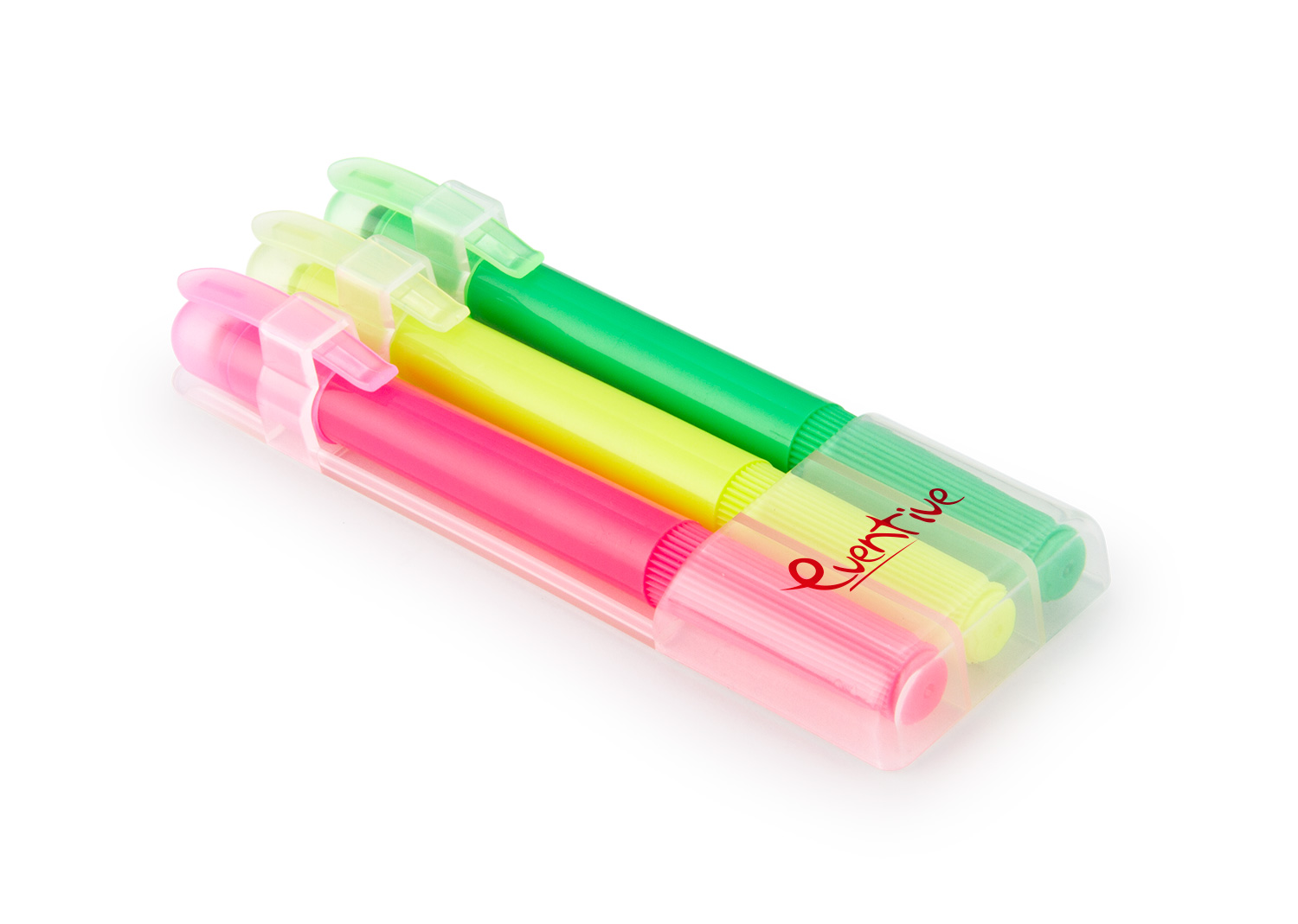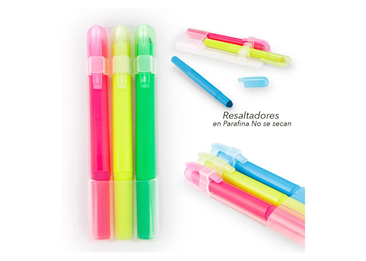 Set de 3 resaltadores en parafina. No se seca. Con tapa y clip. Sistema Twist.