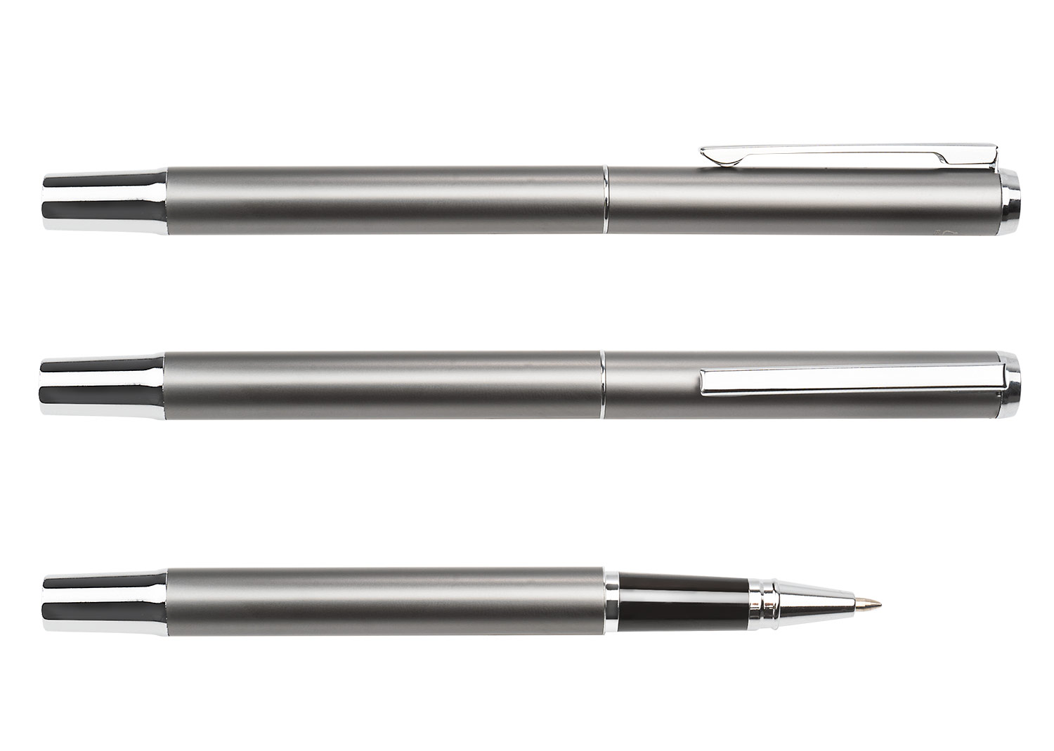 Set de bolígrafos hechos con aluminio reciclado. Cada bolígrafo es retráctil de mina normal más bolígrafo roller, con tapa a presión. Incluyen estuche de lujo.