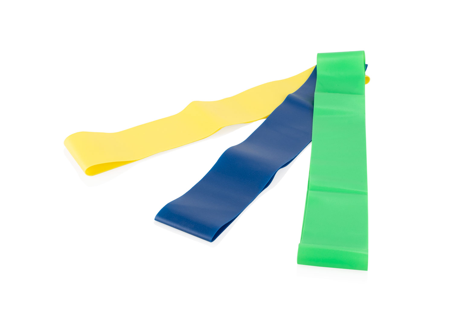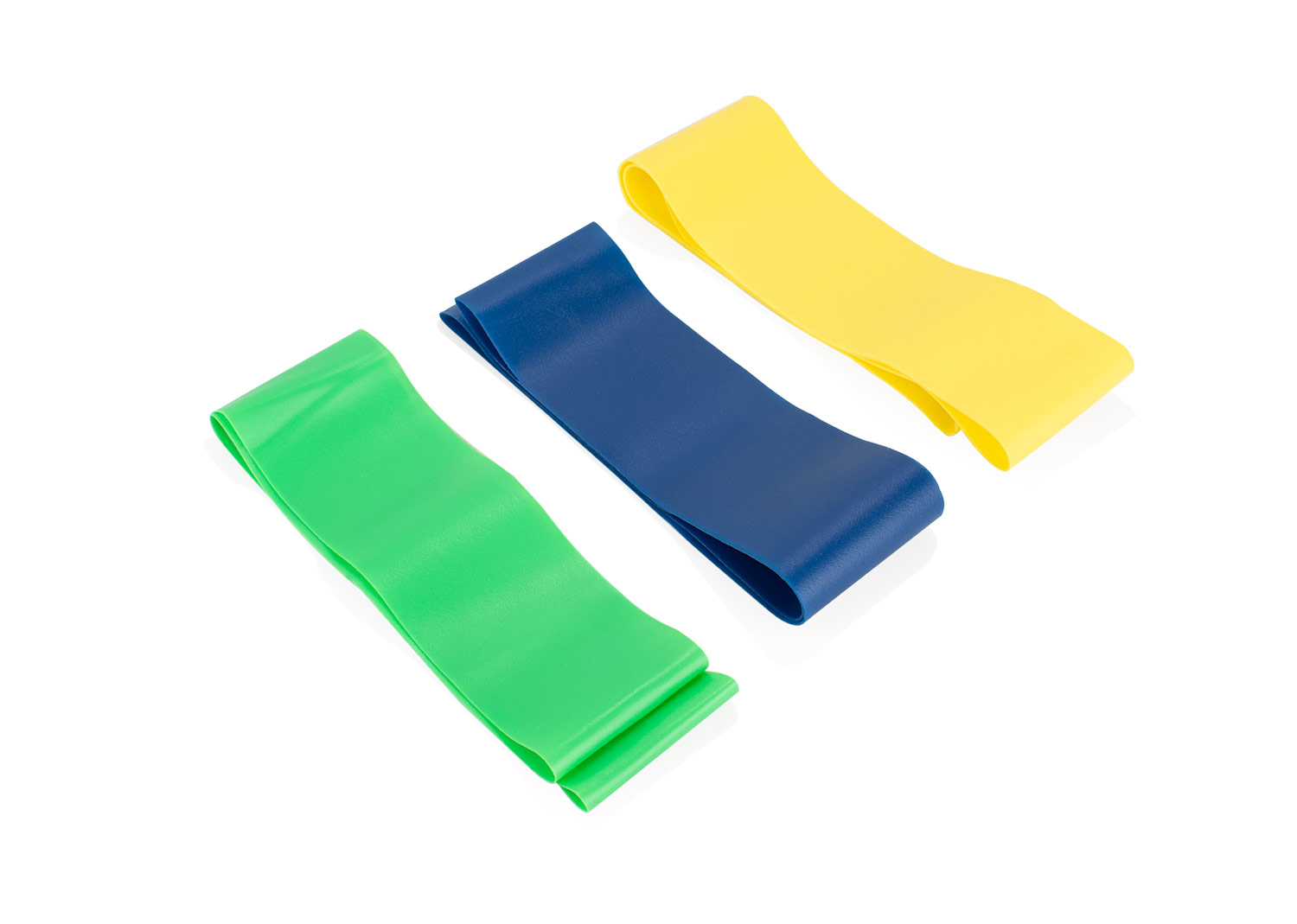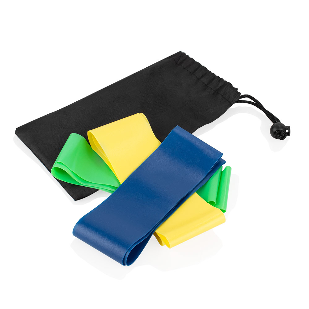 Set de tres bandas de resistencia fabricadas en TPE. Ideales para ejercitarse. Empacadas en Tula.