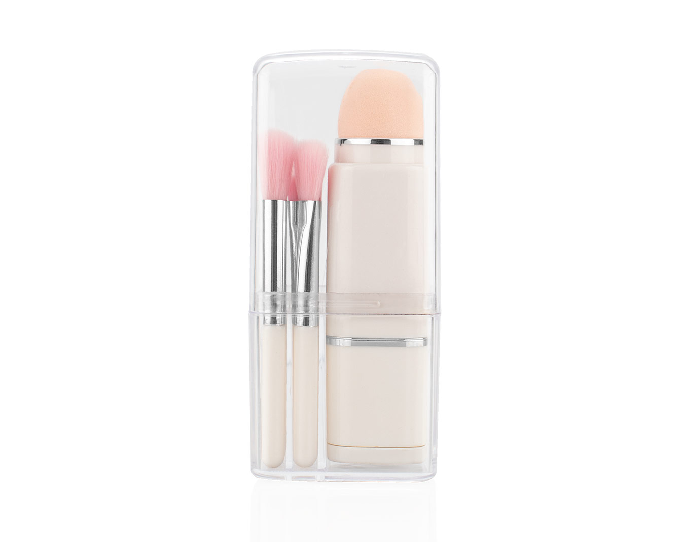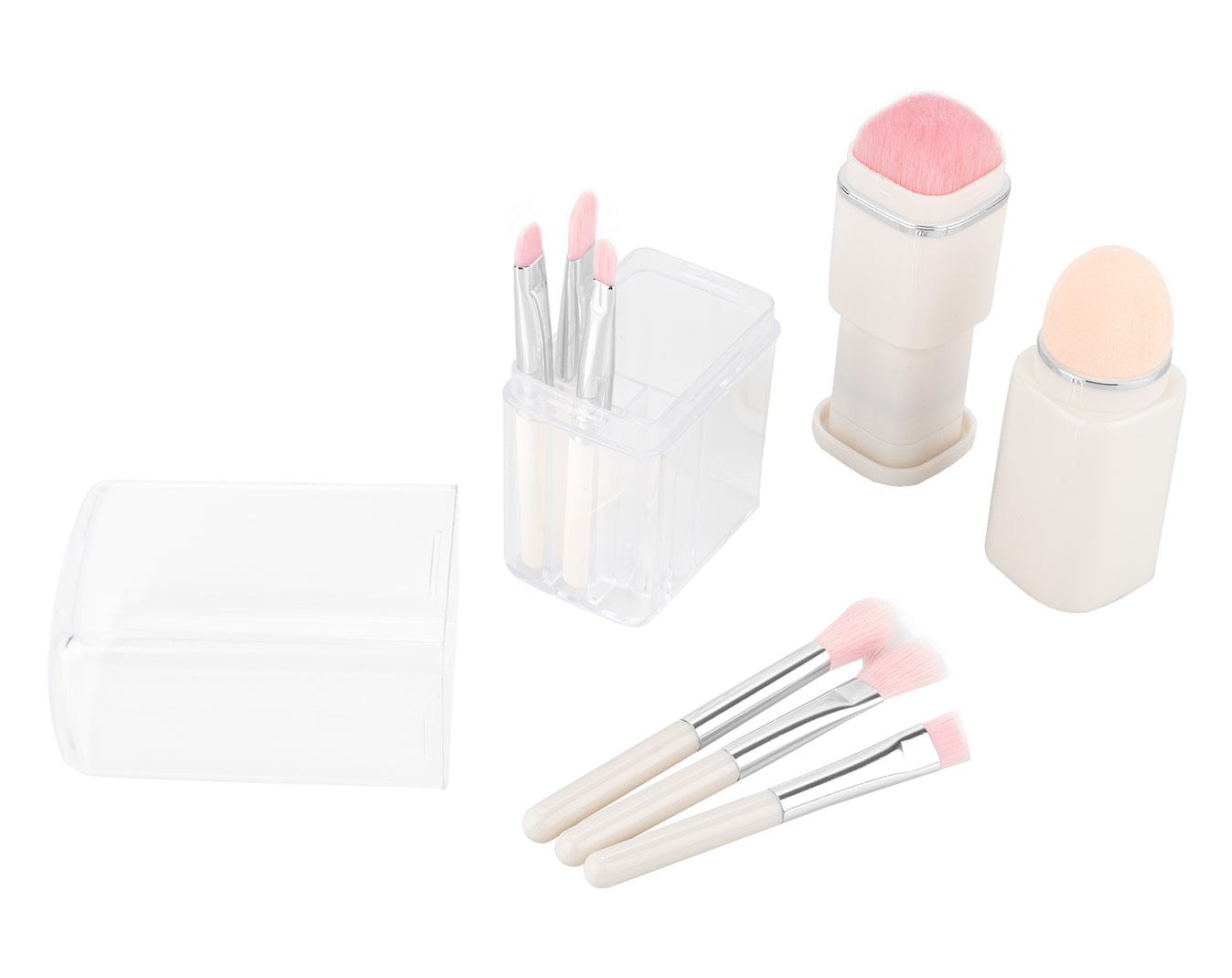 Juego de brochas de maquillaje con diseño compacto y funcional, que incluye 8 piezas organizadas en un estuche con cierre a presión: una bocanada de polvo (2,5 cm), una brocha para polvos (3,5 cm), un pincel para difuminar (1,5 cm), pinceles para sombras en tres tamaños (1,1 cm, 0,8 cm y 0,75 cm), un cepillo para cejas (0,7 cm) y un pincel para labios (1,4 cm). Perfecto para lograr un maquillaje completo en cualquier lugar gracias a su formato portátil y práctico.