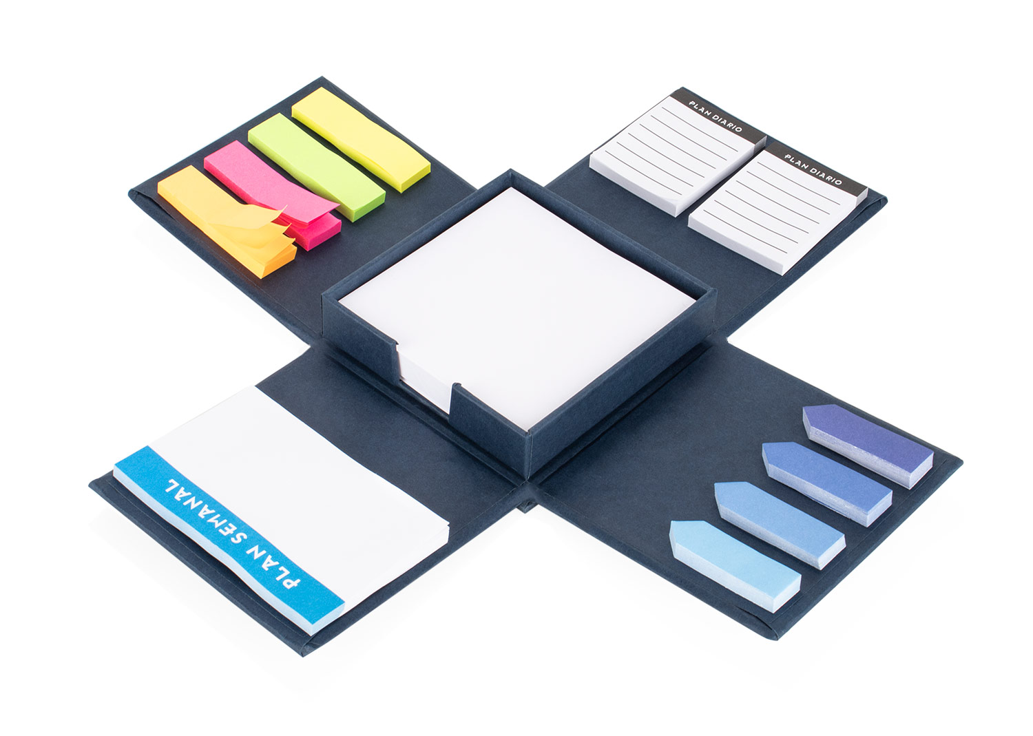 Organiza tu día con creatividad y practicidad. Este innovador set de memos viene en un estuche con forma de cubo con tapas magnetizadas, que al abrirse revela todo lo que necesitas para planificar: un plan semanal (8,9 X 5,3), dos planes diarios (4 X 5,1) y dos juegos de adhesivos separadores para marcar tus tareas. En el centro, encontrarás hojas blancas para anotaciones rápidas, todo en un diseño compacto que aporta estilo a tu escritorio. ¡Ideal para mantener tus ideas claras y siempre a la mano!