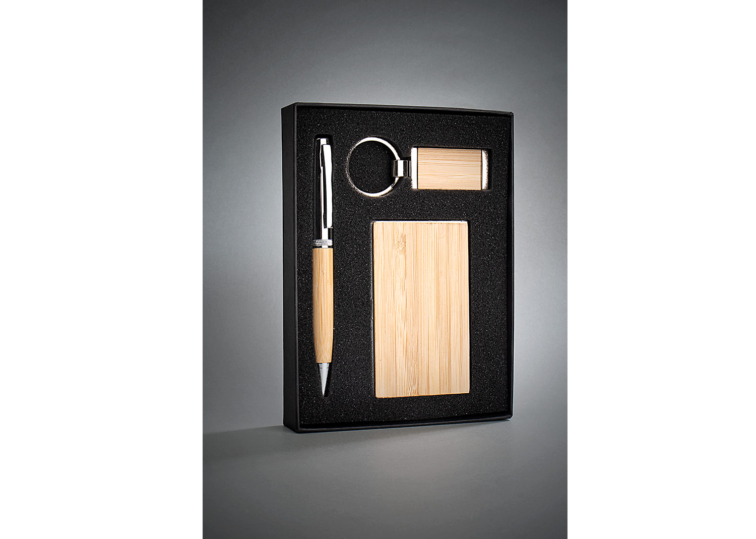 Set ejecutivo, incluye porta tarjetas metalico, llavero metalico rectangular y bolígrafo en Aluminio con sistema twist, todos con acabados en Bambú para la marca en laser, caja de regalo negra
