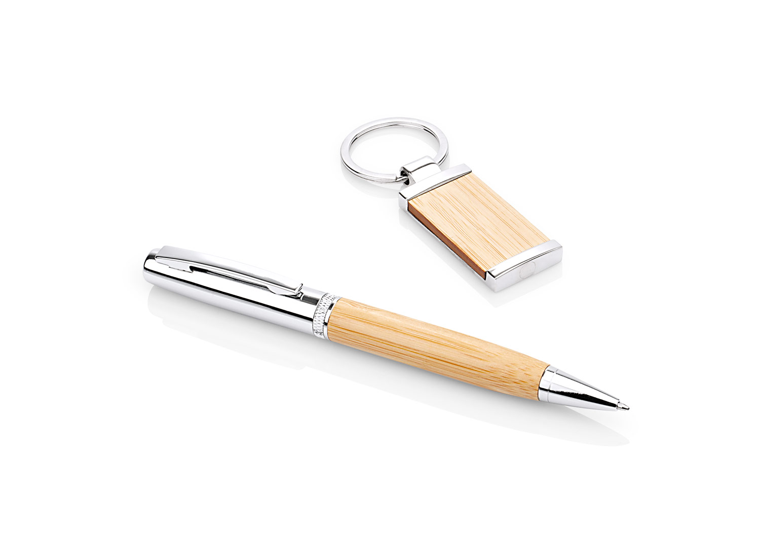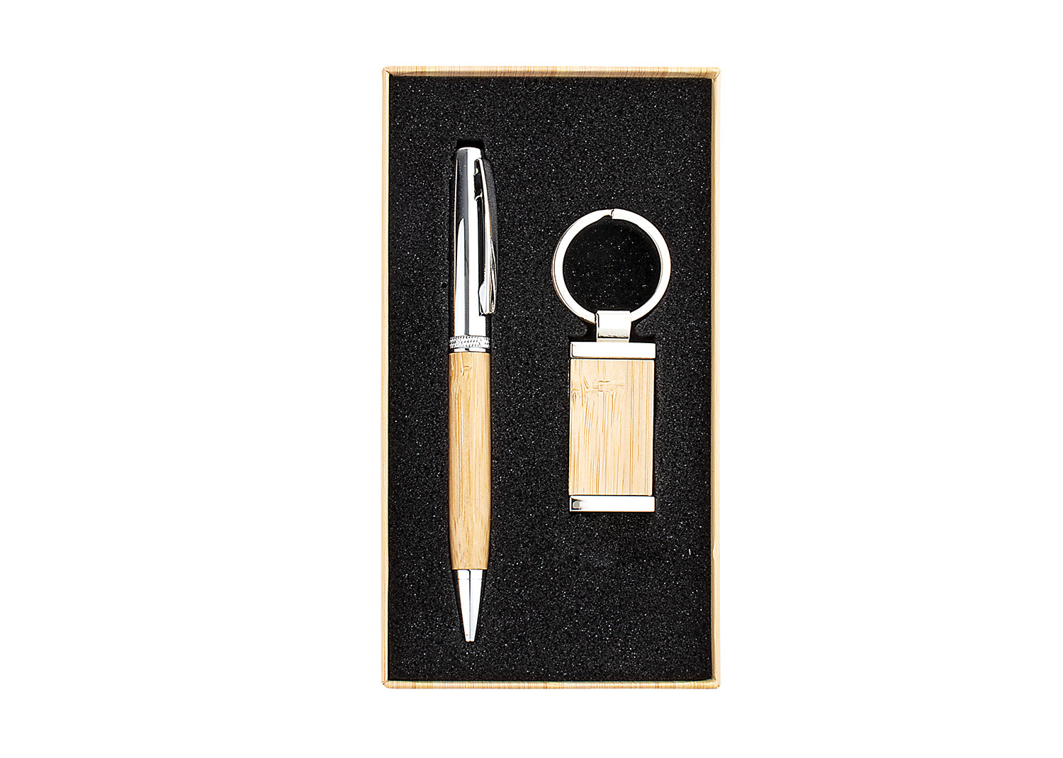 Set ejecutivo, incluye llavero metálico rectangular y bolígrafo en Aluminio con sistema twist ambos con acabados en Bamboo para la marca en laser