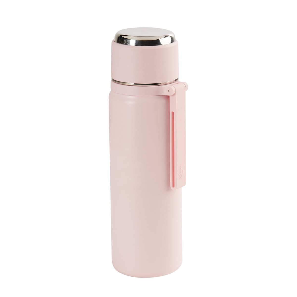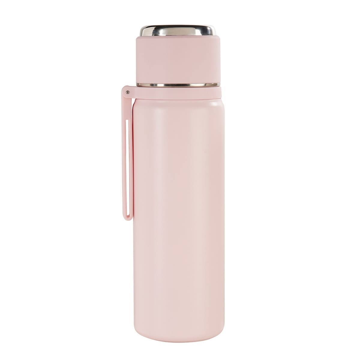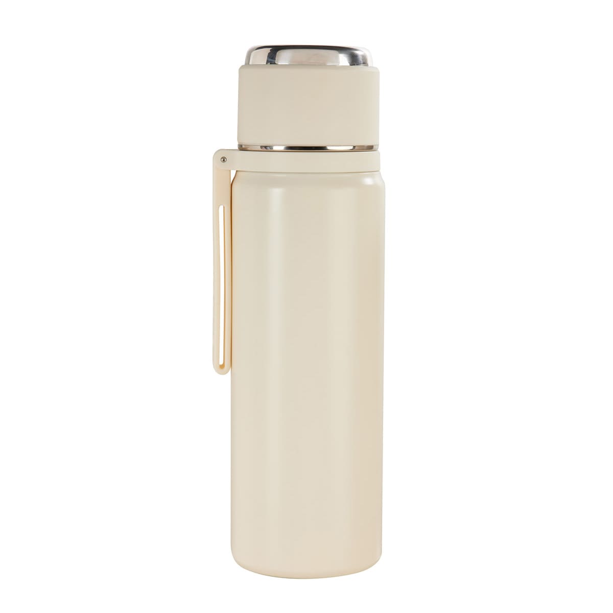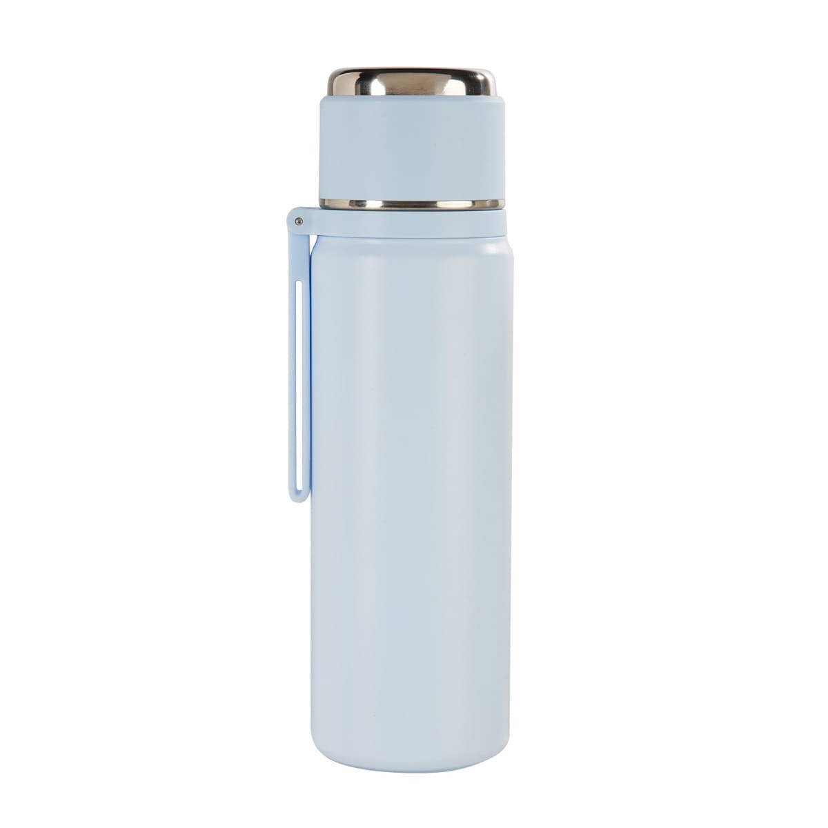 Termo doble pared. Cerrado al vacío. Pared interna y externa acero inoxidable. Tapa de plástico con sistema de rosca, boquilla y botón de seguridad para mantener cerrado y sin derrames, incluye sobre tapa metálica de rosca. Cuenta con un asa de silicona para llevarlo fácilmente a donde quiera que vayas. Mantiene la temperatura caliente por 12 hrs y la temperatura fría por 24 hrs. Capacidad de 17 Oz. Incluye caja individual.