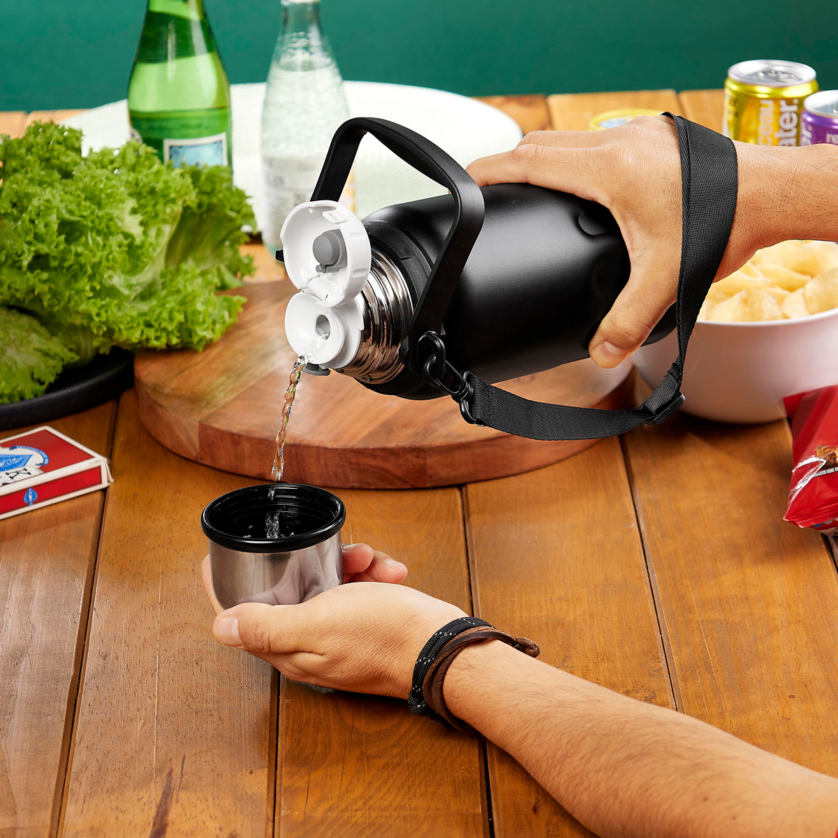 Termo doble pared. Cerrado al vacio. Pared interna y externa acero inoxidable y cuerpo con terminado tipo rugoso. Tapa de plastico con sistema de rosca, boquilla y boton de seguridad para mantener cerrado y sin derrames, incluye sobretapa metalica de rosca. Ademas, agrega un asa plegable de plastico y un asa de poliester removible, que facilita su traslado. Mantiene la temperatura caliente por 10 hrs y la temperatura fria por 12 hrs. Capacidad de 40 Oz.