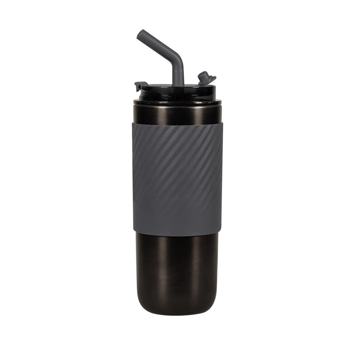 Termo Doble pared. Cerrado al vacio. Pared interna y externa de acero inoxidable.Tapa con sistema de rosca, sobretapa de push y ranura especial con tapon para popote. Incluye popote metalico con boquilla de silicon. Banda de silicon antiderrapante. Mantiene la temperatura caliente por 6 hrs y fria 12 hrs aproximadamente.